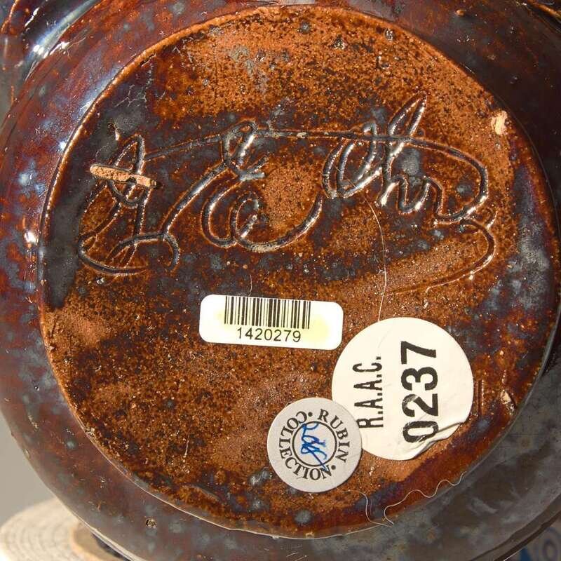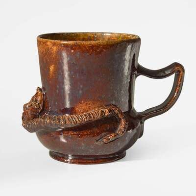 George Ohr (American, 1857-1918) Mug with Snake in Mirrored Speckled Brown with Speckled Olive Interior, Biloxi, Mississippi, USA, circa 1898-1910