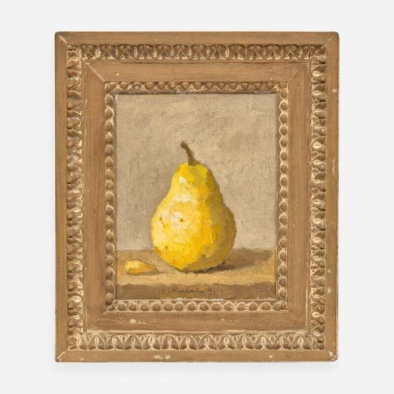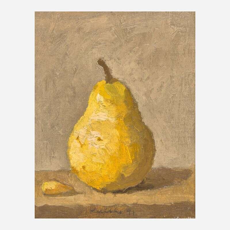 Robert Kulicke (American, 1924–2007) Single Yellow Pear with an Almond on a Light Grey Background
