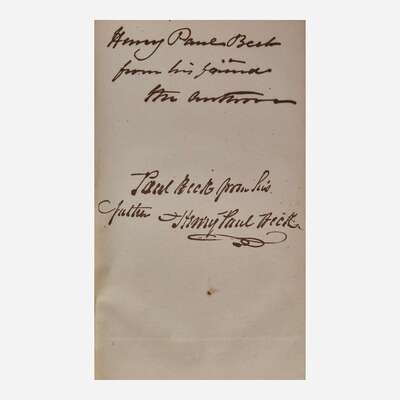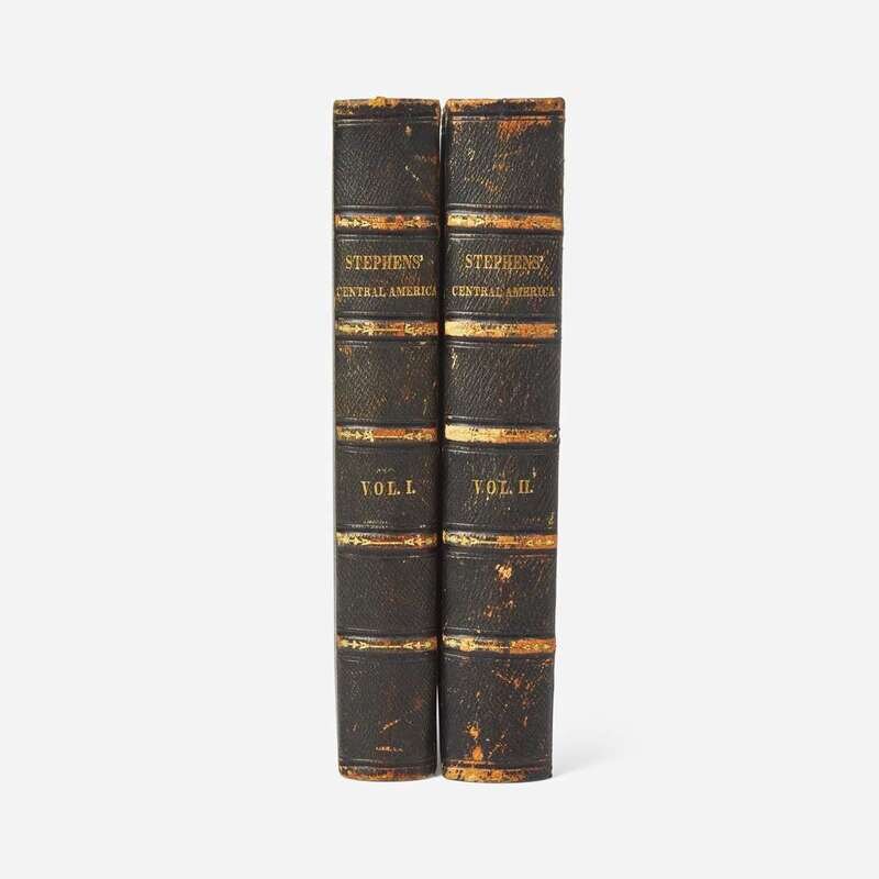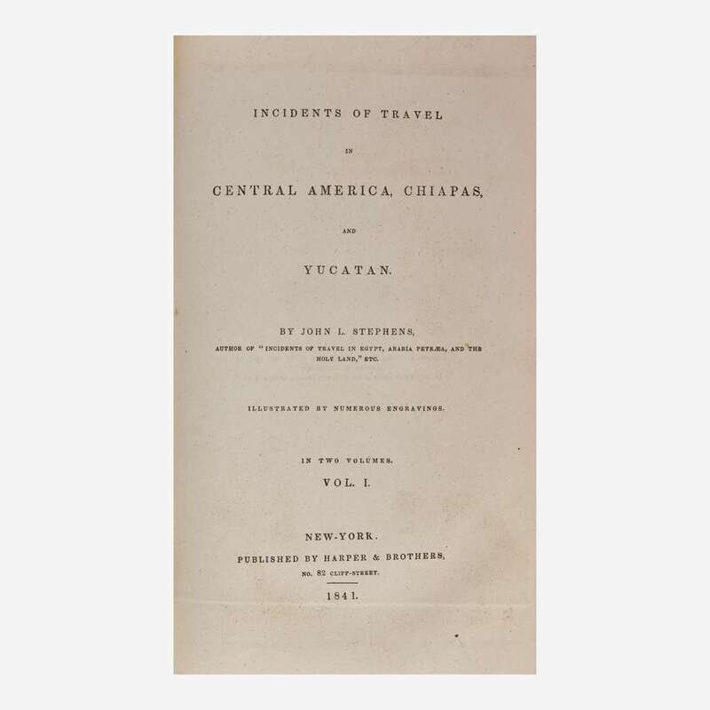 New-York: Harper & Brothers, 1841. In two volumes. First edition. 8vo. Presentation copy, inscribed by the author John L. Stephens on third blank: "Henry Paul Beck from his friend the author"; further inscribed from Beck to his son below. Illustrated with an engraved frontispiece, 68 engraved plates after sketches by Frederick Catherwood, one folding map, and a few in-text illustrations. Publisher's full dark blue morocco, stamped in blind and in gilt, spines rubbed; marbled edges, matching marbled endpapers; top of title-page of Volume II excised; scattered light foxing to text and plates; book-plate of Henry Paul Beck on front paste-down of each volume; book-plate of Hammond Museum Library in rear of each volume. Sabin 91297