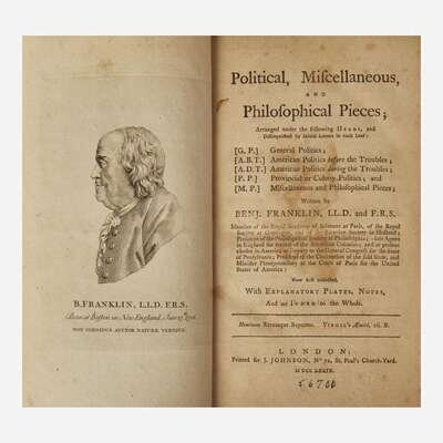 A scarce edition of Benjamin Franklin's collected writings, "the only edition of Franklin's writings (other than his scientific), which was printed during his lifetime." (Ford). This edition was prepared by Benjamin Vaughan, a close friend of Franklin's, with Franklin's knowledge and consent.