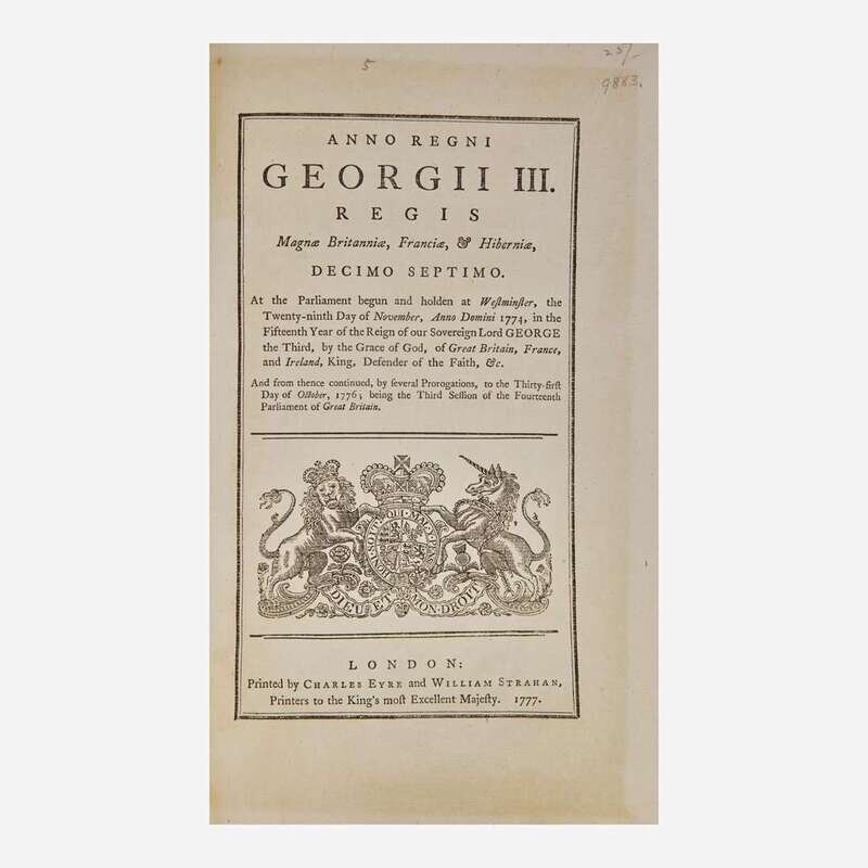 A significant and scarce Act of Parliament issued at the beginning of the American Revolution. "Whereas a Rebellion and War have been openly and traitorously levied and carried on in certain of His Majesty's Colonies and Plantations in America, and Acts of Treason and Piracy have been committed on the High Seas, and upon the Ships and Goods of His Majesty's Subjects, and many Persons have been seised and taken, who are expressly charged or strongly suspected of such Treasons and Felonies, and many more such Persons may be hereafter so seised and taken." The Act allowed persons suspected of committing treason--especially aiding in the American rebellion--to be thrown into jail without a warrant or the issue of formal charges, and then held without trial.