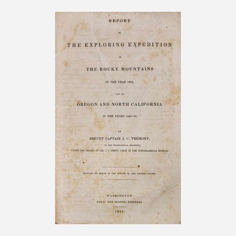 First edition of John C. Fremont's important and sizable report on his two government-funded western expeditions, which covered over 20,000 miles of wilderness. His descriptions, as well as the illustrations, gave American readers their first impressions of the rugged Rocky Mountains and the landscape surrounding them. In many ways this text served as a guide for many pioneers pushing west, hoping to enact America's Manifest Destiny.