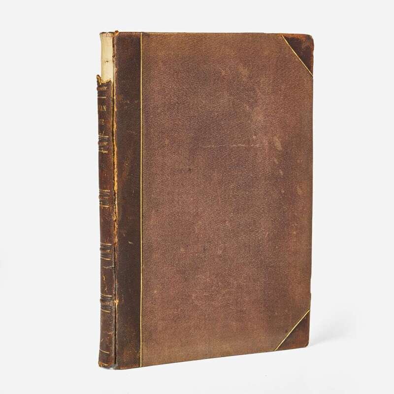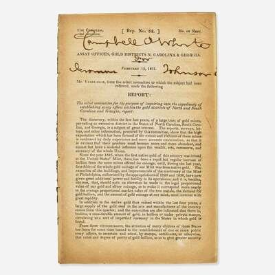 Albany, N.Y: Joel Munsell/London: Trubner & Co., 1858. First edition (one of only 200 copies printed). 4to. viii, 151, (5) pp. Illustrated with five color plates. Publisher's three-quarter brown morocco over brown pebbled cloth-covered boards, stamped in gilt, lightly soiled, upper portion of spine perished, front board detached; old gift inscription on a front blank. Lot includes: Rep. No. 82: Assay Office, Gold Districts N. Carolina & Georgia. (Washington D.C.), February 15, 1831. Printed Congressional Report.