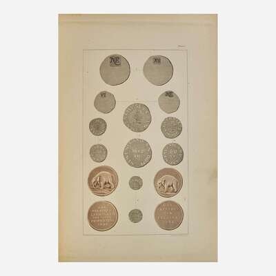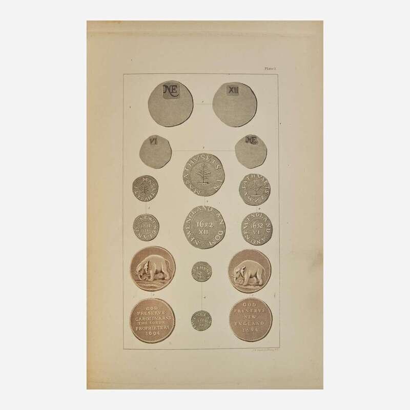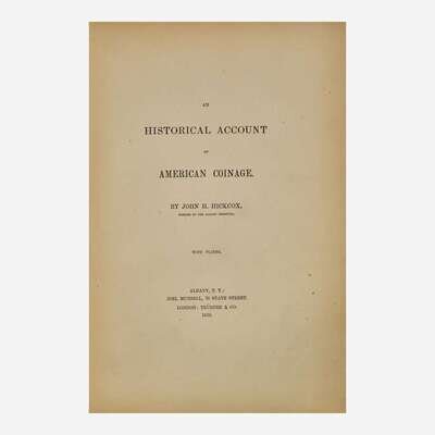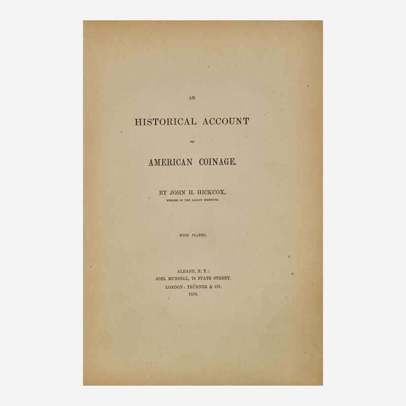 First edition of the first substantial work published on American coins. John H. Hickcox (1832-1897) was a librarian and bookseller, who worked at the New York State Library and the Library of Congress in addition to being a numismatist. He writes in his preface, "The design of this work is to give an account of the legally authorized coinage of the United States of American, during the periods of their colonial history and their existence as a united republic. Nothing as comprehensive has heretofore been attempted..."