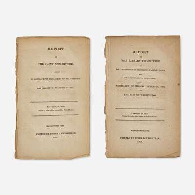 Scarce collection of two official Senate reports pertaining to the sale of former President Thomas Jefferson's library to the United States Congress. During the War of 1812, the British entered Washington, D.C. and set fire to the Capitol building, destroying nearly all of the 3,000-plus-volume-library within. Jefferson was particularly distressed at the news and offered to sell his library to Congress to help them rebuild. At the time Jefferson had the largest personal collection of books in the country, held at his plantation, Monticello. He had planned to offer this library to Congress upon his death, but considering the circumstances and Congress's likely inability to rebuild on their own, he offered his at any valuation and payment terms Congress saw fit. His only stipulation was that they accept the library in full. The first report, dated November 28, 1814, presents the bill to the Senate for Jefferson's 6,487 volume library, for a price of $23,950. The second report, dated February 20, 1815, is a request for additional funds to build a reading room and to help cover the costs of transporting the library from Monticello. The books were shipped beginning in April, 1815, with the last wagonload arriving in Washington that May.