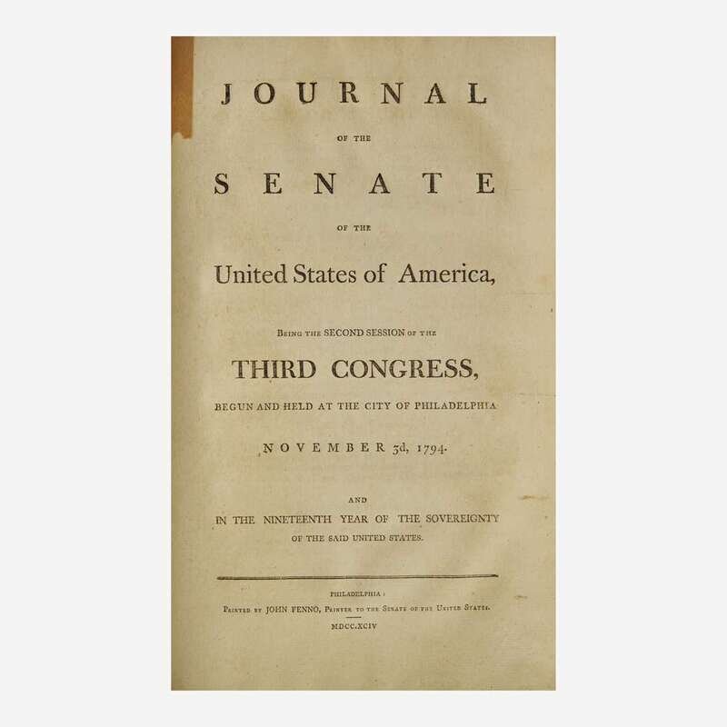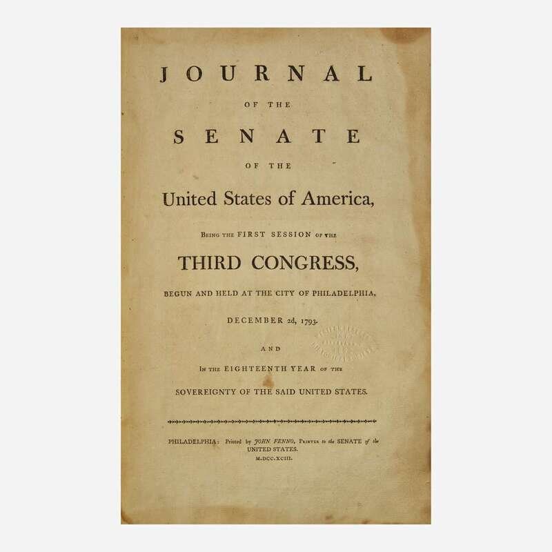 A well-preserved copy of the Journal of the only two sessions of the United States Senate during the Third Congress of the United States. The Senate met at Congress Hall in Philadelphia, the first session held from December 2, 1793-June 9, 1794, and the second session from November 3, 1794-March 3, 1795. This period covered the beginning of George Washington's second term as President of the United States, and includes his December, 1793 Address opening the first session--his first upon being re-elected--as well as his message of December 5 concerning French Minister Edmund Genet, who has "breathed nothing of the friendly spirit of the nation which sent him," and whose meddling in American affairs, has "been to involve us in war abroad, and discord and anarchy at home." It was during February, 1794 that the Senate held its first ever public session, resolving on Tuesday, February 11, "That the doors of the Senate be opened." Also reported is Washington's opening message to the second session of Congress, on November 19, 1794, that largely addresses the outbreak of the Whisky Rebellion in Western Pennsylvania, in which "some of the citizens of the United States, have been found capable of an insurrection."