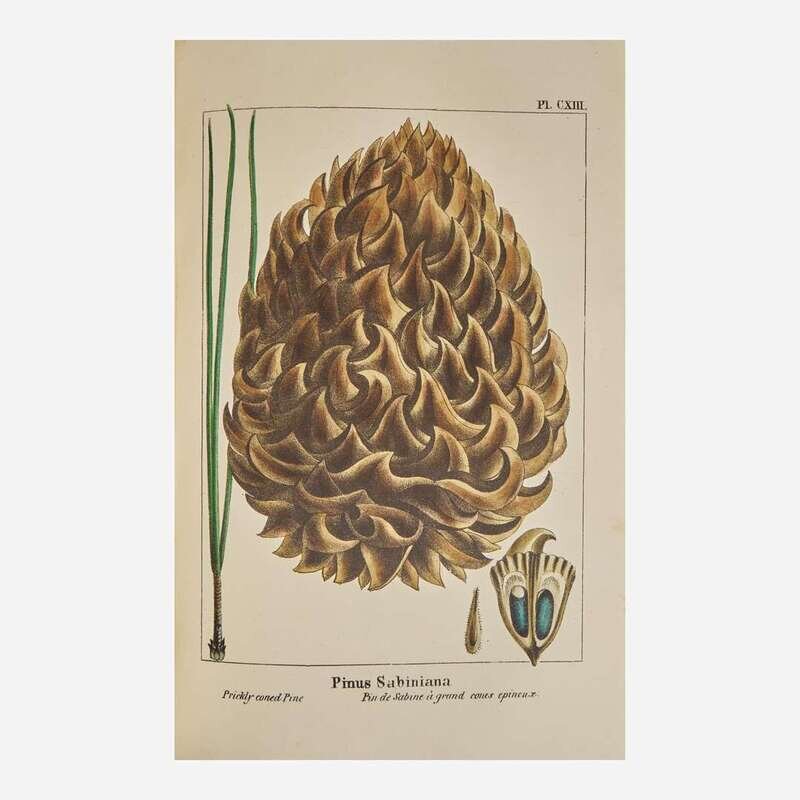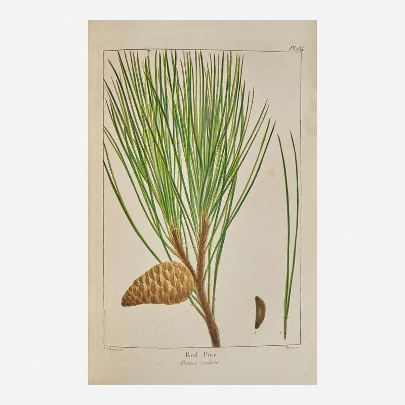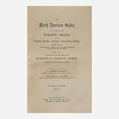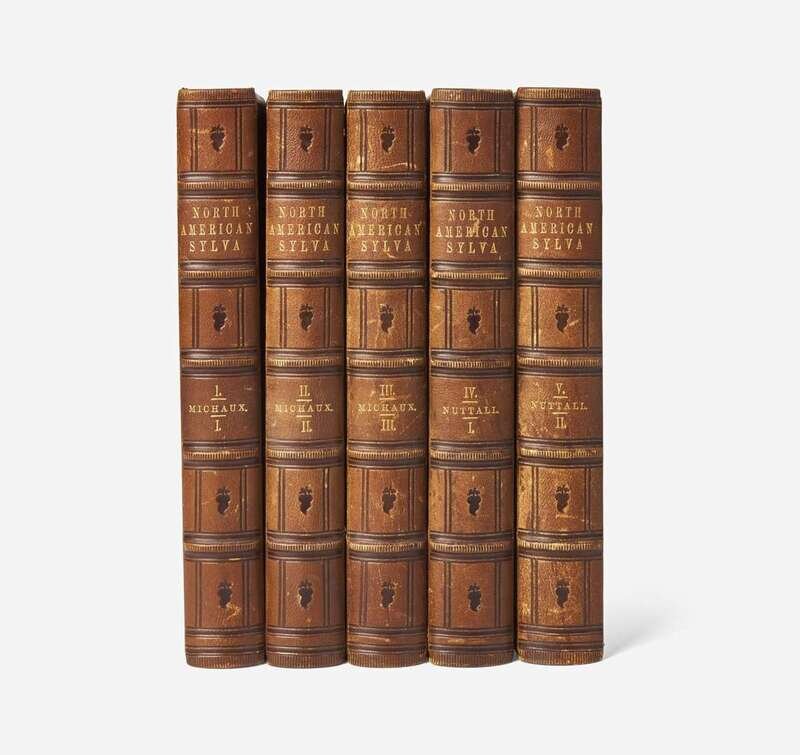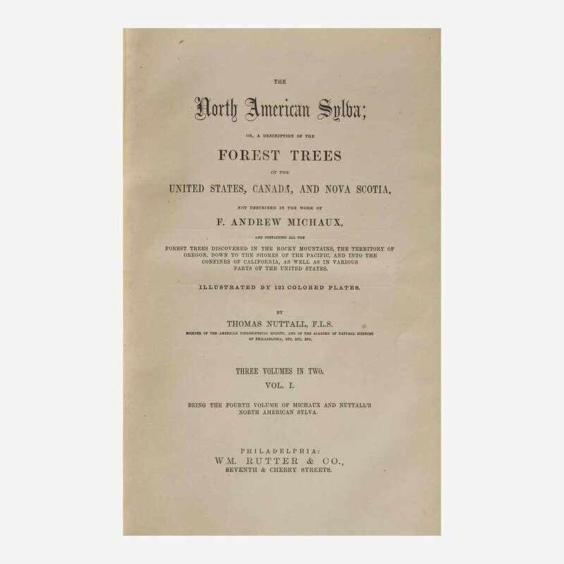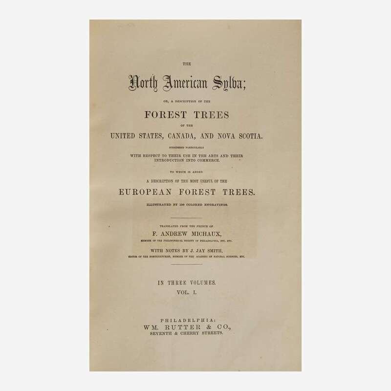 Philadelphia: Wm. Rutter & Co., (1865)-1871. In five volumes (including two volumes of Thomas Nuttall's supplement, as issued: The North American Sylva...Not Described in the Work of F. Andrew Michaux...). Early edition. 8vo. Illustrated with an engraved frontispiece portrait of Michaux by H.B. Hall after the painting by Rembrandt Peale, and 277 hand-colored plates (comprising 156 hand-colored engraved plates after the Redoute brothers, Pancrace Bessa, et al., with tissue guards, in first three volumes; 121 hand-colored lithographic plates, with tissue guards, in fourth and fifth volumes). Publisher's deluxe full brown morocco, boards elaborately stamped in blind, spines lettered in gilt; all edges gilt; scattered light foxing to text and plates. Sabin 48695; Reese, Stamped with a National Character, 21