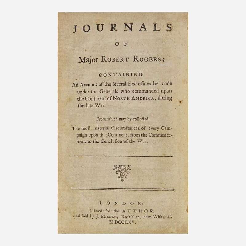 First edition of Robert Rogers's classic first-person account of the French and Indian War. Published when Rogers was only 34-years-old, this narrative recounts nearly six years of his exploits while serving as a scout, and then as a captain leading the independent company of soldiers from New Hampshire attached to the British Army, eponymously named "Rogers' Rangers". During the war he executed numerous raids with the Rangers against the French and their Native American allies, often behind enemy lines, in Pennsylvania, New York, and Ohio. This account, along with his Concise Account of North America (1765) made him famous in America.