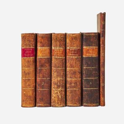 Philadelphia: Printed and Published by C.P. Wayne, 1804-07. In six volumes (including the scarce atlas volume). First edition. Five 8vo volumes and one 4to volume. First volume illustrated with an engraved frontispiece portrait of Washington; atlas volume illustrated with 10 engraved maps (eight double-page), plus the 22-page Subscriber's list. Text volumes bound in contemporary full mottled calf, red morocco spine labels, stamped in gilt, moderately worn and rubbed; all edges trimmed; old ownership signature excised in first, second, and fifth volumes, and partially scratched out in third volume, but not affecting text; heavy foxing to frontispiece portrait; scattered foxing to text in all volumes. Atlas volume bound in quarter tan calf over marbled paper-covered boards, boards and extremities moderately worn and rubbed; all edges trimmed; offsetting and foxing to maps, some tape repairs to versos of same; dampstaining in upper gutter of Subscriber's list; 8vo volumes in cloth slip case. Howes M-317; Sabin 44788