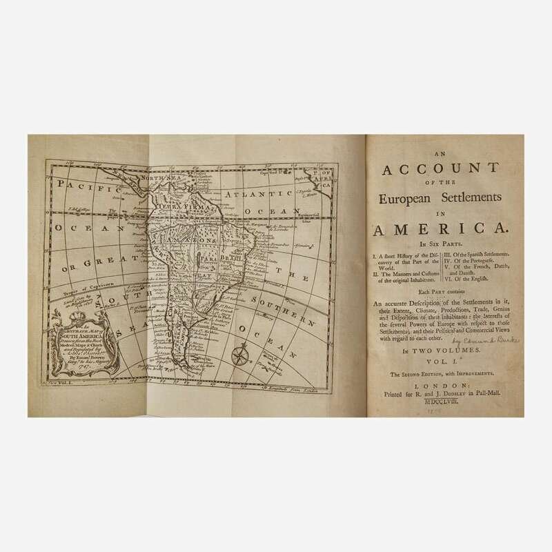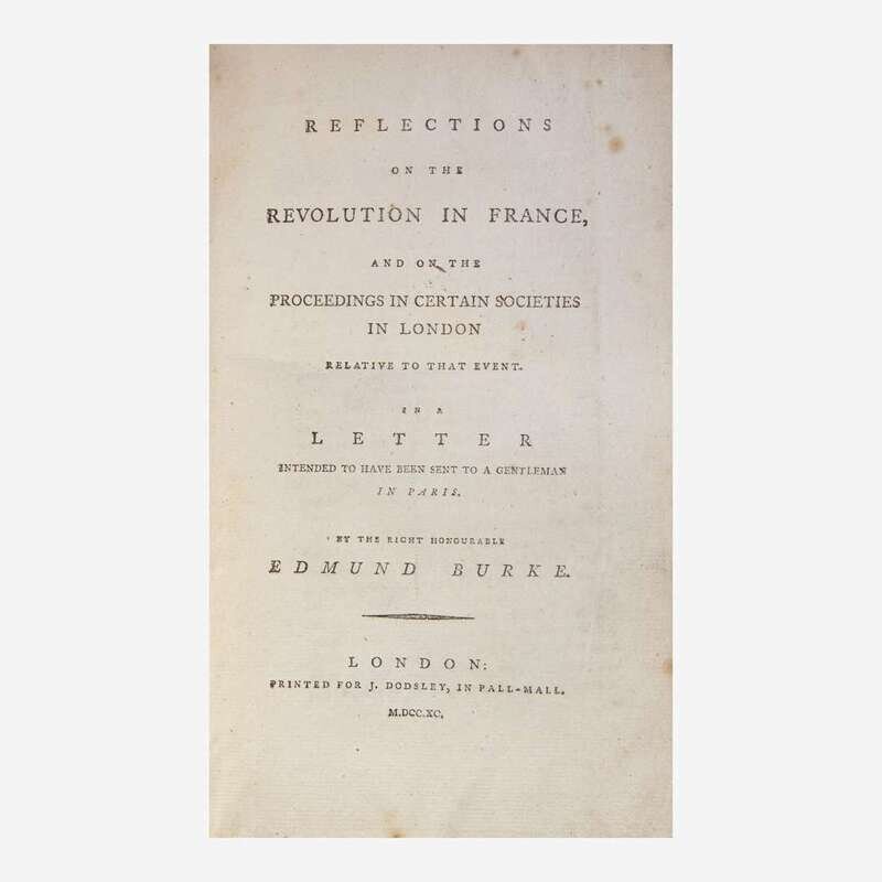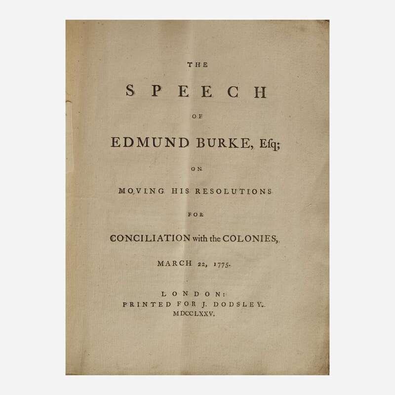 A handsome and unsophisticated first edition of Edmund Burke's speech given before Parliament urging reconciliation between Great Britain and her revolting 13 North American colonies--rare in original wrappers. "The proposition is Peace. Not Peace through the medium of War; not Peace to be hunted through the labyrinth of intricate and endless negociations; not Peace to arise out of universal discord, fomented, from principle, in all parts of the Empire; not Peace to depend on the Juridical Determination of perplexing questions; or the precise marking the shadowy boundaries of a complex Government. It is simple Peace; sought in its natural course, and in its ordinary haunts.--It is Peace sought in the Spirit of Peace; and laid in principles purely pacific." Burke's speech was made in response to Prime Minister Lord North's Propositions for Conciliating the Differences with America, passed by the House of Commons in February, 1775, that sought conciliation by the rescinding of taxes and other duties to colonial governments who agreed to provide for the common defense and the administration of justice. Burke criticized this plan as a means to divide the colonies, and here requests that Parliament repeal many of the laws that enflamed colonial tensions. Ultimately neither would prove successful, as Burke's conciliation was rejected, and in less than a month hostilities would break out at Lexington and Concord, on April 19.