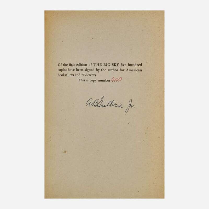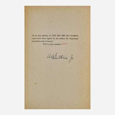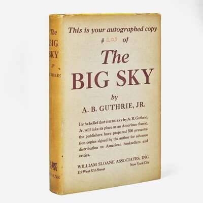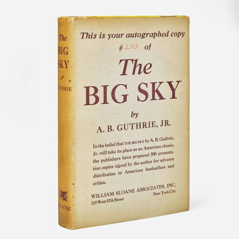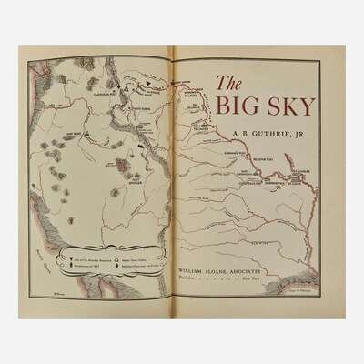A near-fine copy of Pulitzer Prize-winning American author A.B. Guthrie's first Western novel, and the first of his six historical novels about the Oregon Trail and the development of Montana. The basis for the 1952 Howard Hawks film starring Kirk Douglas.