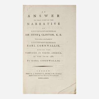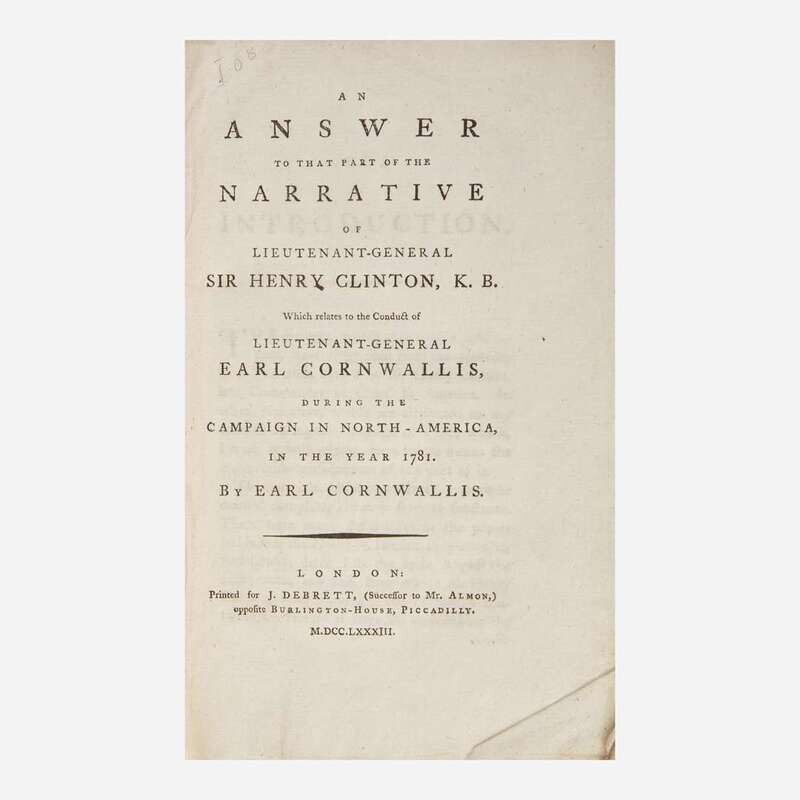 A fine and untrimmed copy of British General Cornwallis's acrimonious response to British General Sir Henry Clinton's Narrative of the Campaign of 1781 in North America (1783), in which Clinton attempted to lay the blame for the British defeat at Yorktown on Cornwallis. Cornwallis responds here with a chain of correspondence between him and Clinton during the campaign, used to explain his role in the defeat.