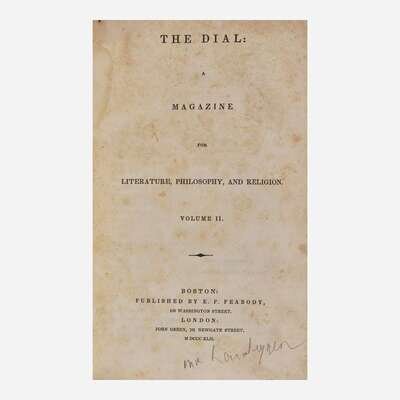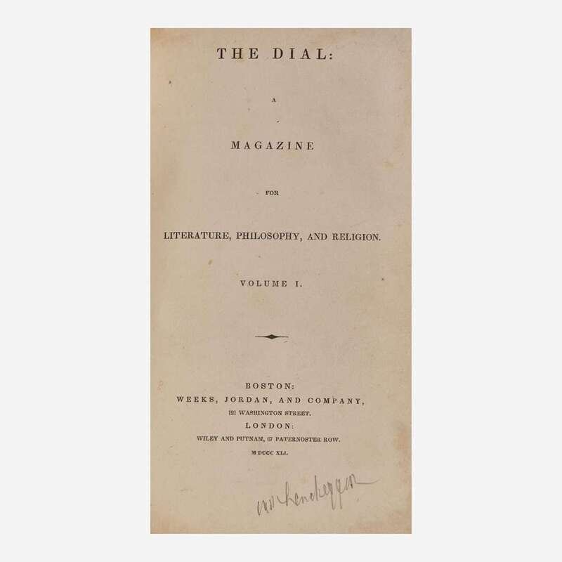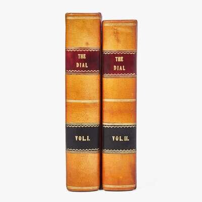 A handsome collection of the principal publication of the Transcendental Movement, featuring some of the earliest printed appearances of Henry David Thoreau. His poem Sympathy, only his second-ever appearance in print (pp. 71-72 in Vol. I, No. I, signed "T"), followed by Aulus Persius Flaccus, his third (Vol. I, pp. 117-121), Stanzas, his fourth (Vol. I, No. III, p. 314), Sic Vita, his fifth (Vol. II, No. I, pp. 81-82), and Friendship, his sixth (Vol. II, No. II, pp. 204-205). These were preceded only by an unsigned obituary he wrote for the Yeoman's Gazette, published on November 25, 1837.