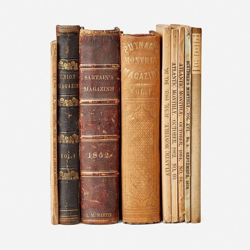 A scarce copy of John Sartain's Union Magazine, featuring the first printed appearance of any part of Henry David Thoreau's then unpublished masterpiece Walden. Thoreau's two essays are printed in the final two numbers of Vol. XI of Sartain's magazine, the last two published before it ceased operations in August, 1852. The first contribution, "The Iron Horse" is printed in No. 1 on pages 66-68, and the second "A Poet Buying a Farm" is printed in No. 2 on page (127). Walden would not be published for another two years, in 1854 (see lot 55).