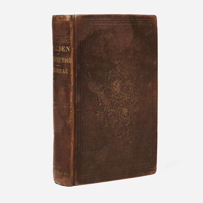 Boston: Ticknor and Fields, 1854. First edition (one of 2,000 copies printed). 8vo. 357, (6), 8 pp. (ads, dated April, 1854). Illustrated with a lithographic plan of Walden Pond, facing p. 307. Publisher's full brown cloth-covered boards, stamped in blind and in gilt, expertly recased; all edges trimmed; shallow tidemark throughout most of text; repaired closed tear in top edge and gutter of pp. 281-288; scattered creasing in top corners of text; occasional minor spotting; in brown cloth fall-down-back box. Borst A2.1.a; BAL 20106; Grolier, American 63