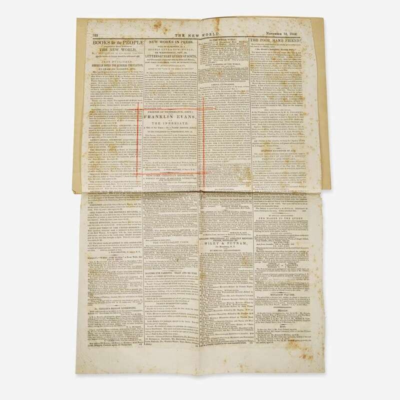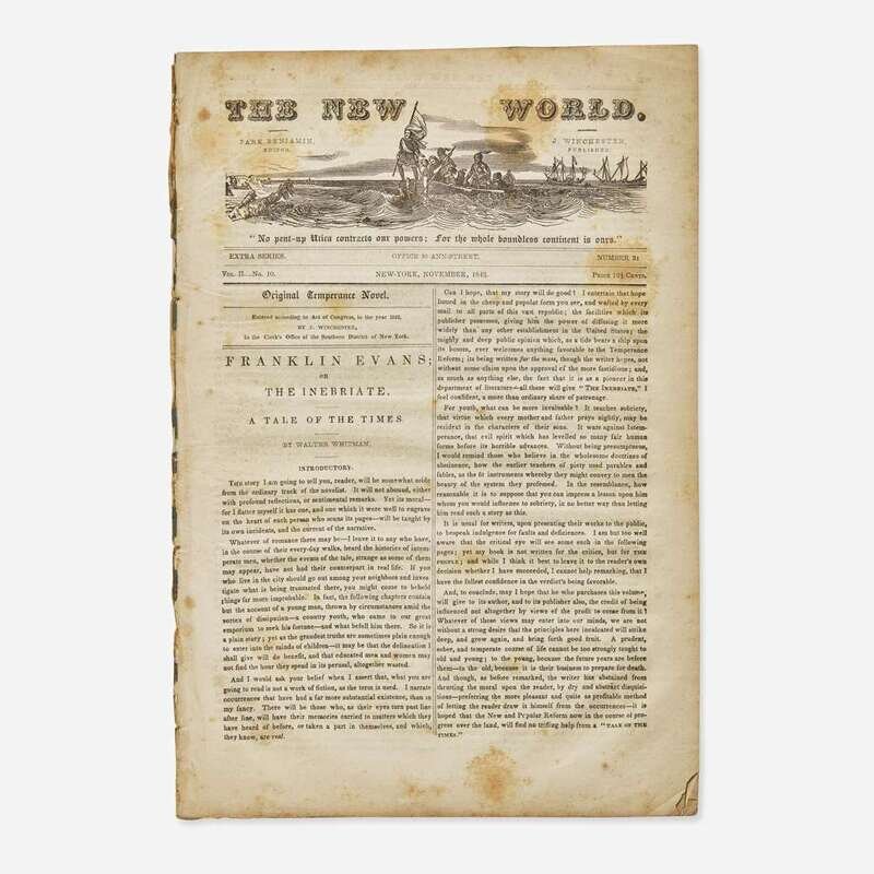 A rare first edition of Walt Whitman's first--and only--novel, and his first separately published work. Whitman's novel was written at the bequest of the editor of The New World, Park Benjamin, and was published as a special extra issue of the newspaper. At the time Whitman was desperate for money, and although the book sold well (20,000 copies)--Whitman was paid $75 upfront, and then an additional $200--he was later embarrassed it, and called it a "damn rot" written in haste in three days.