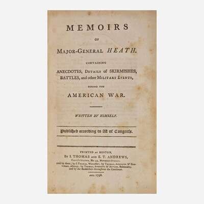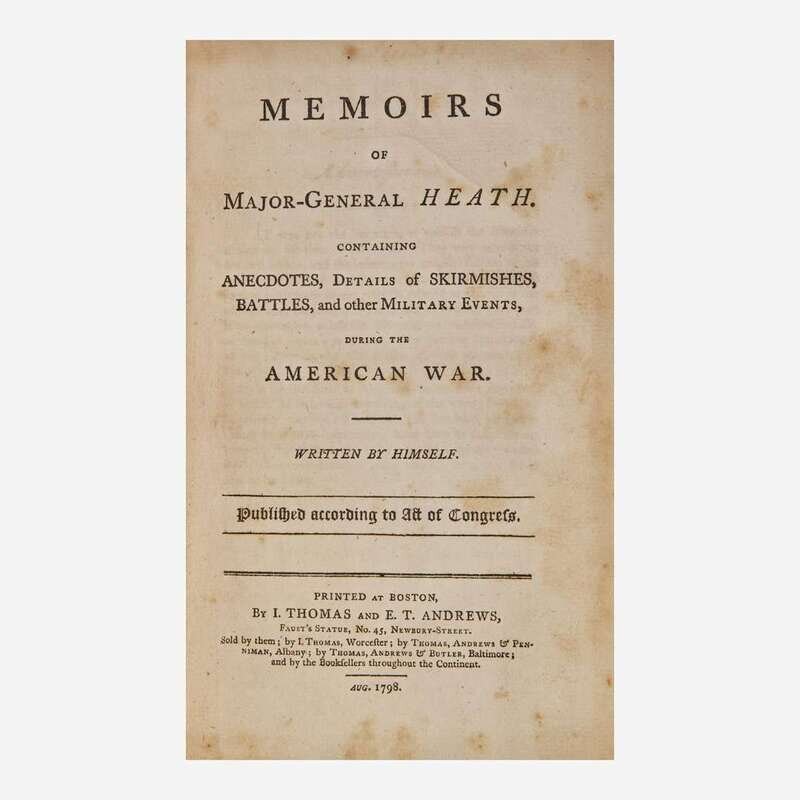 "A work of equal interest and authority; now scarce." (Sabin). William Heath (1737-1814) was a Massachusetts farmer who served in the Continental Army during the Revolution, eventually attaining the rank of Major General, and also served as a member of the Massachusetts State Convention which ratified the Federal Constitution in 1788.