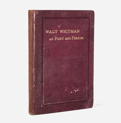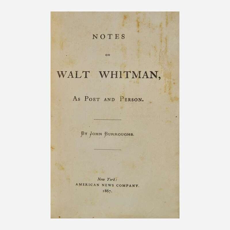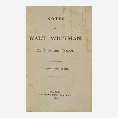 A scarce first edition of the first book on Walt Whitman, and Burroughs's first book. He and Whitman met in 1863 in Washington, D.C., and became lifelong friends. Whitman was intimately involved in the production of this book, and as Burroughs notes, it "abounds in the marks of Whitman's hand," as he provided the title, chapter headings, the whole of chapter 21, as well as the Biographical Notes.