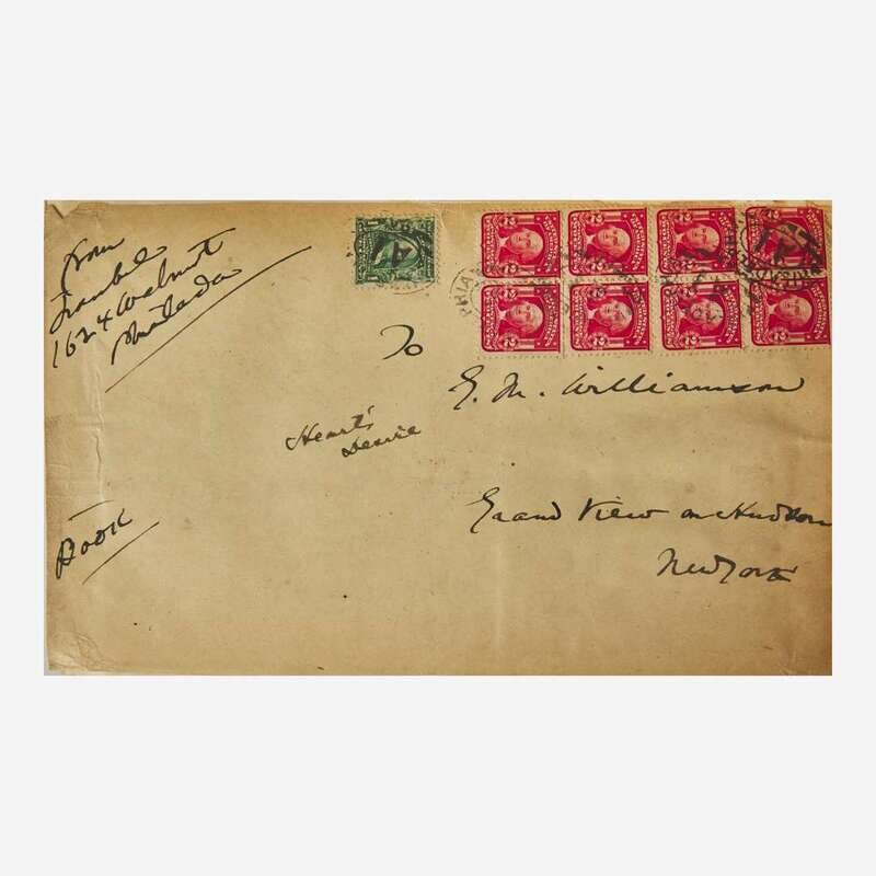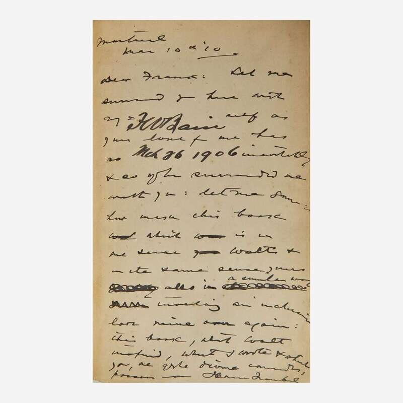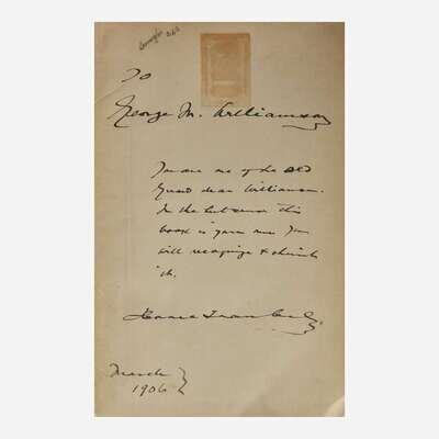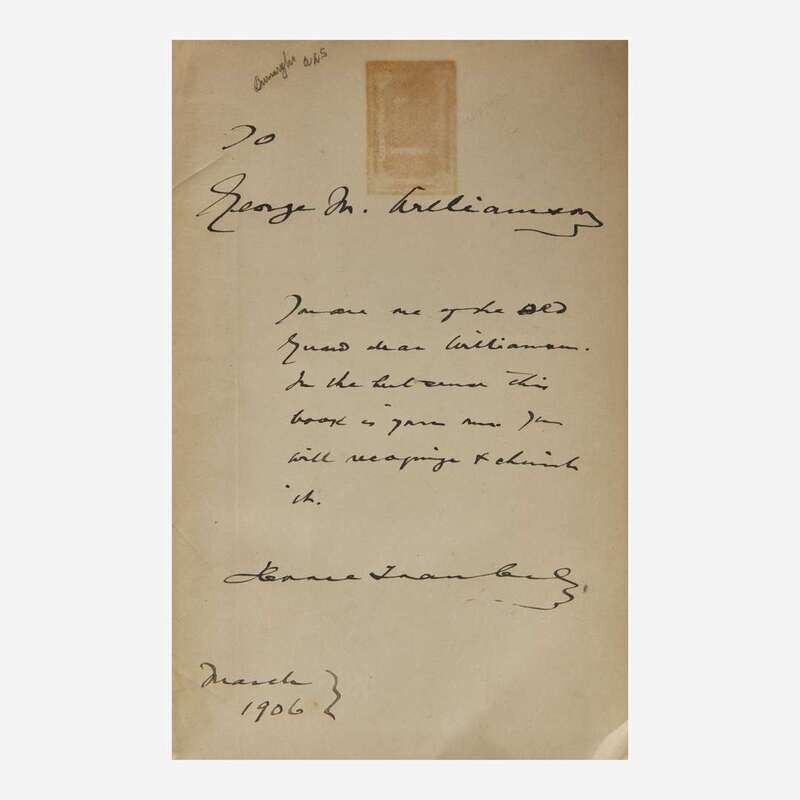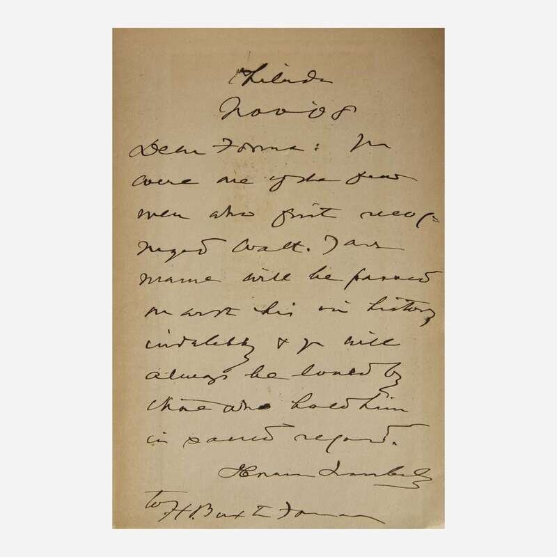 Boston: Small, Maynard & Company/New York: D. Appleton and Company/New York: Mitchell Kennerley, 1906, 1908, 1914. In three volumes. First editions. 8vo. Presentation copy of first volume, inscribed by Traubel on front free endpaper to New York bibliophile George M. Williamson, dated March, 1906, and with part of a mailing envelope signed by Traubel to Williamson tipped in to same; with an additional autograph letter, signed by American naturalist and friend of Walt Whitman, John Burroughs, to Williamson, praising Traubel's work, inserted following half-title of same volume, dated April, 1906. Presentation copy of second volume, signed by Traubel to Victorian-era bibliographer and forger Harry Buxton Forman. Set illustrated with numerous facsimiles and plates. Publisher's blue-green cloth-covered boards, stamped in gilt, scattered wear and rubbing to boards and extremities, spine of third volume darkened, other slightly faded; top edges gilt, other edges trimmed; green morocco book-plate of American collector William Van R. Whitall on front paste-down of first volume; illustrated book-plate of Forman on front paste-down of second volume, with illustrated book-plate of mystery writer and Whitman bibliographer, Carolyn Wells, on top of same; front hinge of third volume worn.