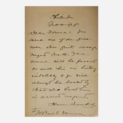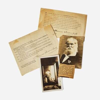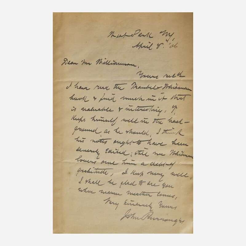 John Burroughs (1837–1921) was an American naturalist and essayist. He met Whitman in Washington, D.C., in 1864, and after returning to Brooklyn he and Whitman commenced a lifelong correspondence. Burroughs would write several books involving or devoted to Whitman's work, including Notes on Walt Whitman, as Poet and Person--the first book on Whitman, see lot--(1867), Birds and Poets (1877), Whitman, A Study (1896), and Accepting the Universe (1924).