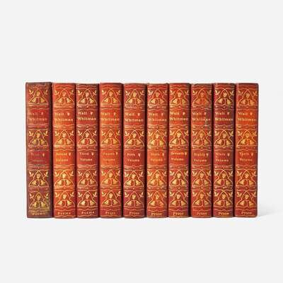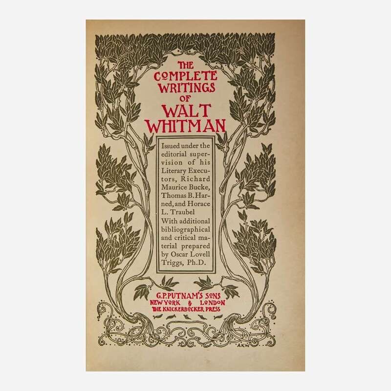 An attractive set of Whitman's complete works, "Issued under the editorial supervision of his Literary Executors, Richard Maurice Bucke, Thomas B. Harned, and Horace L. Traubel. With additional bibliographical and critical material prepared by Oscar Lovell Triggs." (from the title-page).
