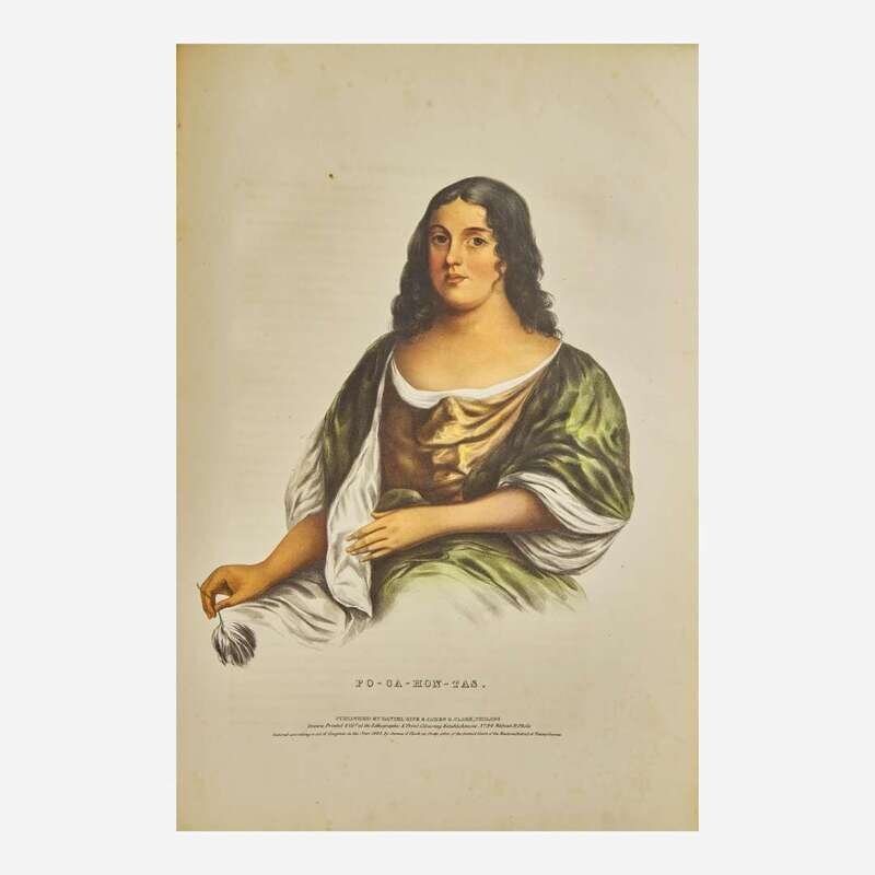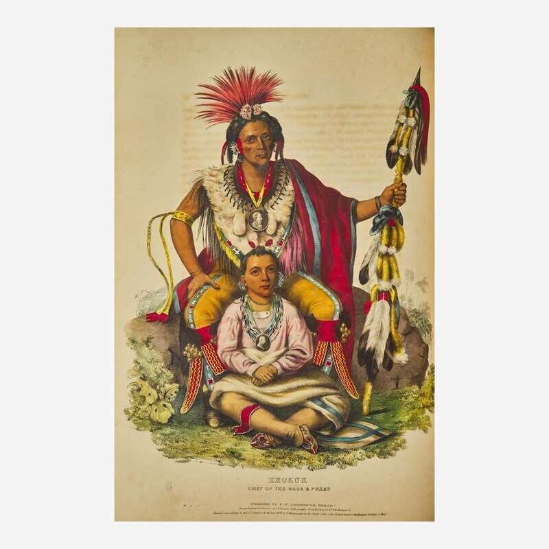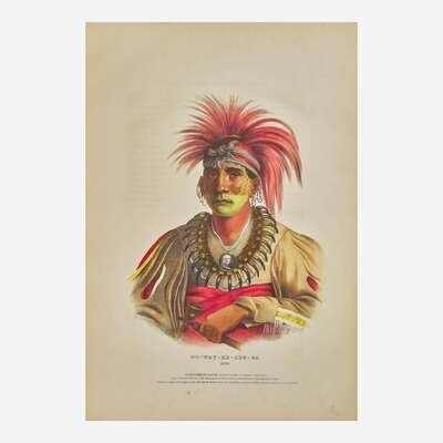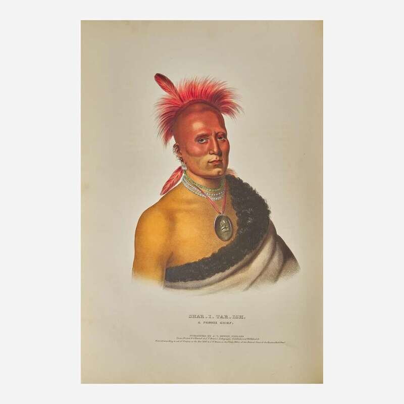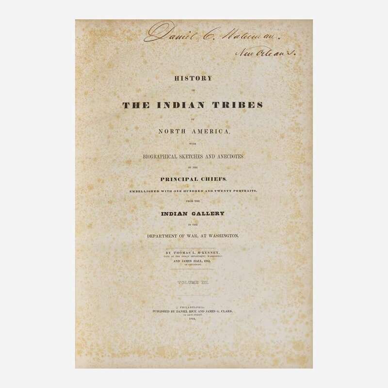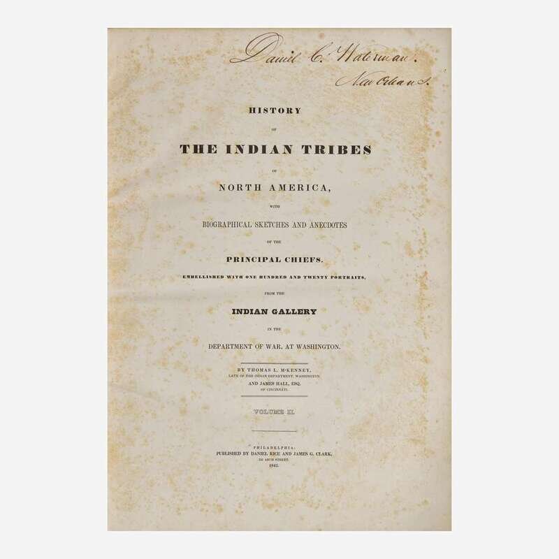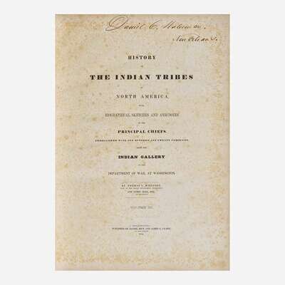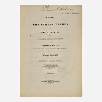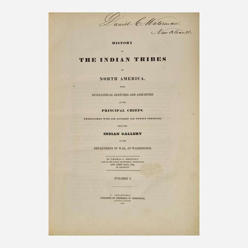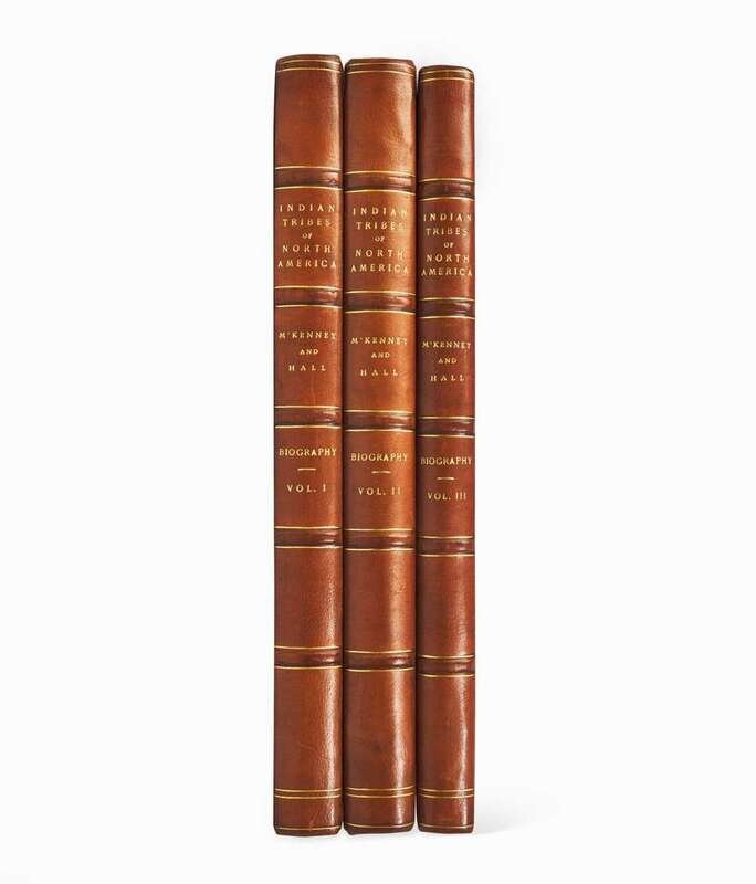Philadelphia: Published by Frederick W. Greenough, 1838 (first volume)/Daniel Rice and James G. Clark, 1842-44 (second and third volumes). In three volumes. First edition, mixed issue (Volume I, BAL State C, third issue; Volume II, State B, second issue; Volume III, State A, first issue). Large folio, 20 3/16 x 14 1/4 in. (513 x 362 mm). Illustrated with three hand-colored lithographic frontispieces and 117 hand-colored lithographic portraits (War Dance, State D; Red-Jacket, State F), with tissue guards, by A. Newsam, A. Hoffy, Ralph Trembley, Henry Dacre, and others, after Charles Bird King, Karl Bodmer, James Otto Lewis, P. Rindisbacher, and R.M. Sully, printed and colored by J.T. Bowen and others; one black and white engraved folding map; 17 pages of subscriber's facsimile signatures. Three-quarter brown morocco, unevenly toned, over brown cloth-covered boards, stamped in gilt, some corners worn; first volume with marbled edges, others without; marbled endpapers; bold contemporary ownership signature of Daniel C. Waterman of New Orleans at top of each title-page; front free endpapers starting in each volume; light to moderate foxing and offsetting to plates; occasional marginal smudging; light to moderate foxing to text in first volume; heavy foxing to title-pages in second and third volumes and throughout text of same; tissue guards variously foxed; frontispiece of second volume moderately toned and foxed, others with offsetting; small creasing in bottom corner of some plates and text in second volume. BAL 6934; Howes M-129; Sabin 43410a; Reese, Stamped with a National Character, 24; Field, Indian Bibliography, 992