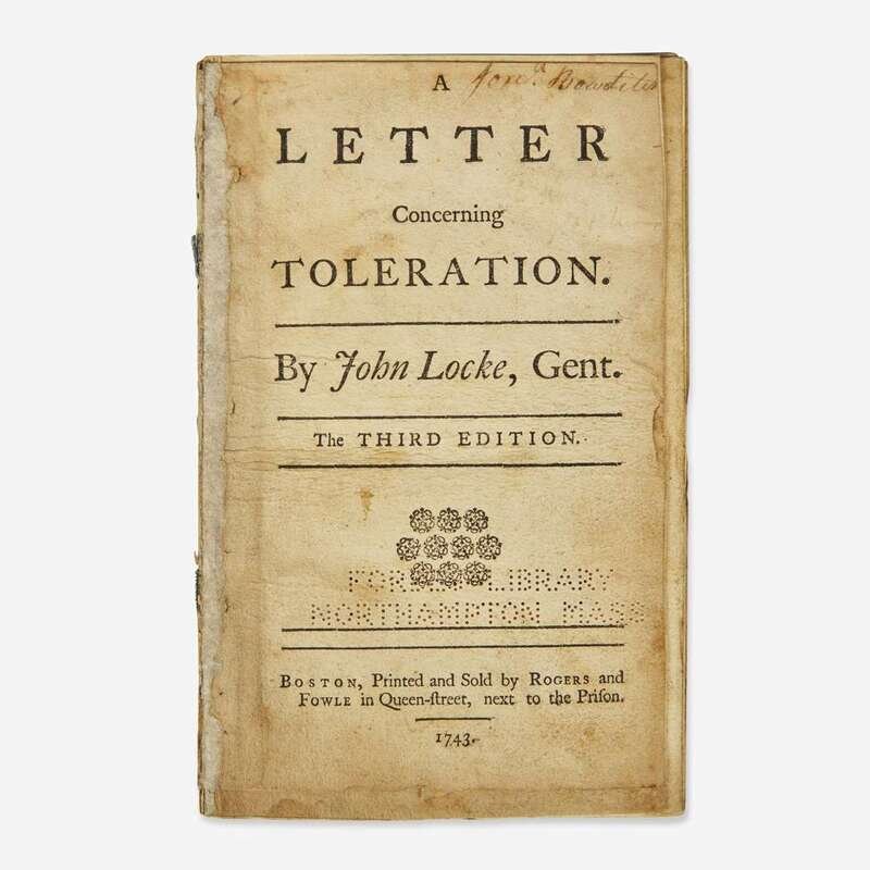 A rare first American edition of John Locke's classic treatise on religious tolerance, a text whose principles would become integral to religious freedom and the separation of church and state in the United States. The publication of this edition in Boston was the result of religious intolerance by the President and Governors of Yale College in New Haven, Connecticut. As Evans explains, quoting John Trumbull's History of Connecticut: "The intolerant spirit of the president and governors of Yale College in regard to the observance of religious forms, at this time, determined a number of the senior class to reprint Locke's Essay of Toleration, and a considerable number of subscribers were obtained. The president learning of it, reprimanded them for their conduct, and ordered them to make a public confession, or else they should not have their degrees. All made the required confession but one. 'The day before commencement he found his name was not in the catalogue of his class, who were to have their degrees; he waited on the president and corporation to know the reason why his name was not in the catalogue: he was told that he had told that he had been in the mischievous business of carrying about subscriptions for the reprinting of Mr. Locke on toleration. He told them he was of age, and had property, and if he could not have his degree, he would appeal to the king in council...Some time after, a freshman was sent to him, acquainting him that the president and corporation wished to see him. He waited on them, and they treated him with much complaisance, and told him to appear with his class and take his degree.'"
