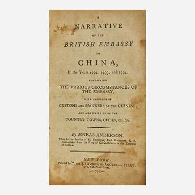 One of the first works published in America about China, written only a decade after trading relationships were established between the two countries. Includes a two-page glossary of Chinese words. The author of the book, Aeneas Anderson, was a valet for Lord George McCartney at the first British Embassy established in Beijing. His observations provide a first-hand account of Chinese customs of the time.