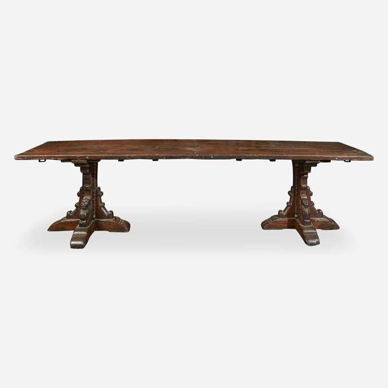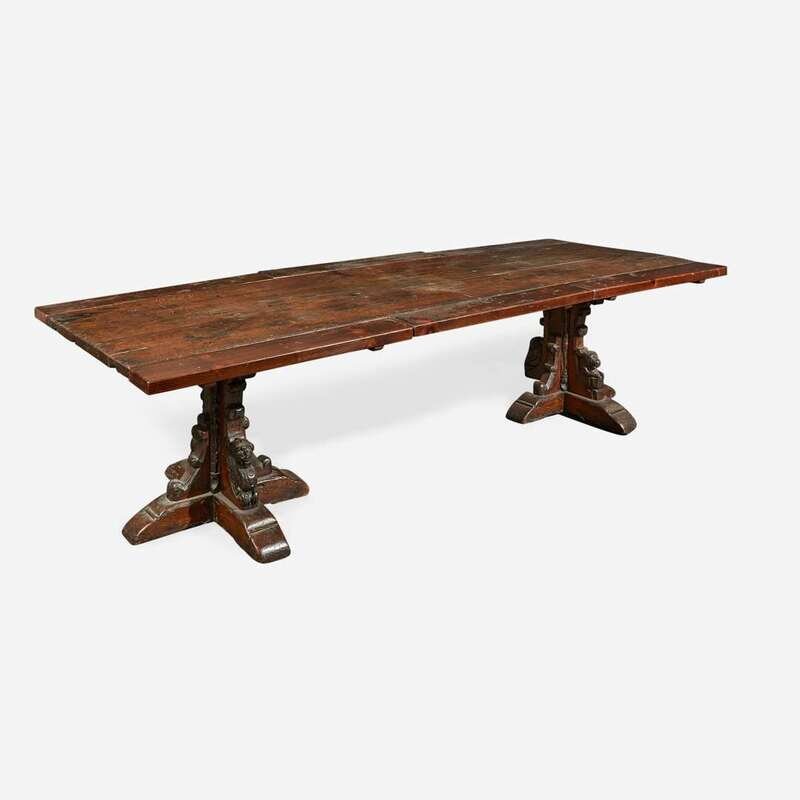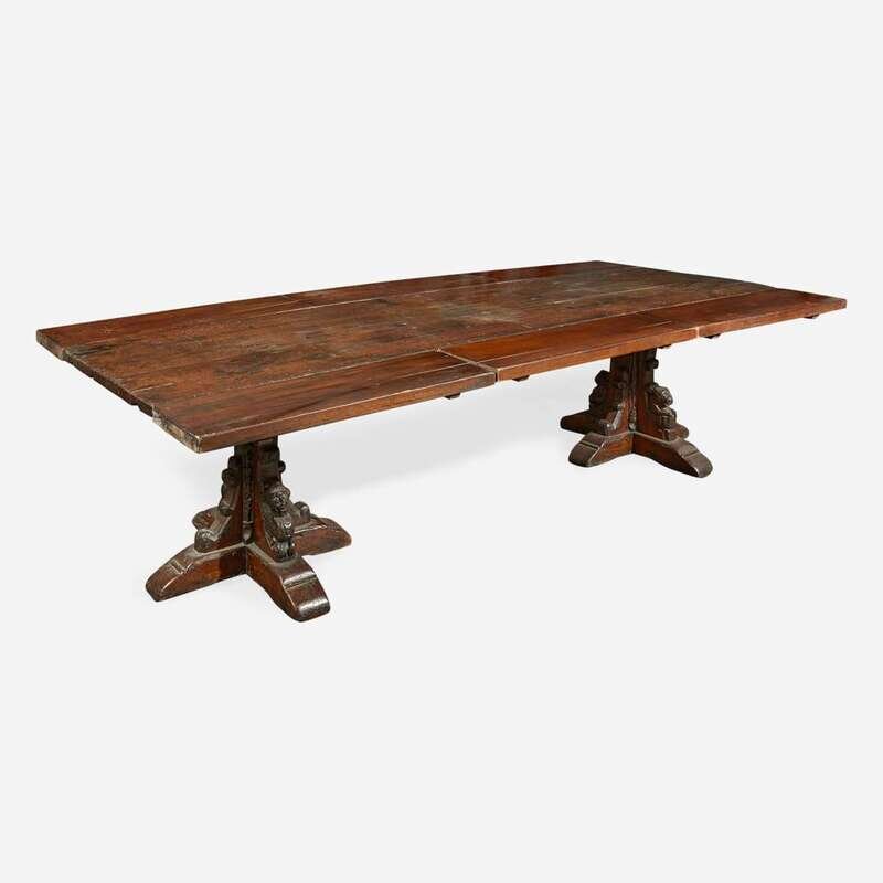 Rectangular top assembled from old planks of wood, with metal loops underneath for fastening extension leaves, with two wood supports comprised of architectural corbels, some carved with figures or gargoyles, accompanied by twelve extension leaves.