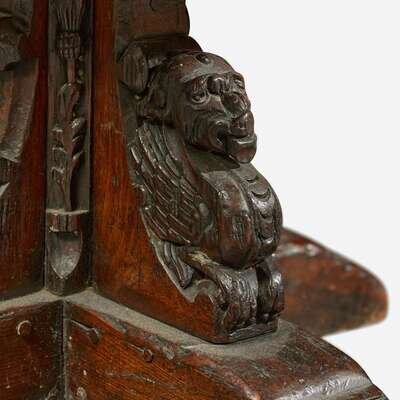 A Gothic Revival carved oak dining table composed of elements likely dating to the 17th century and later