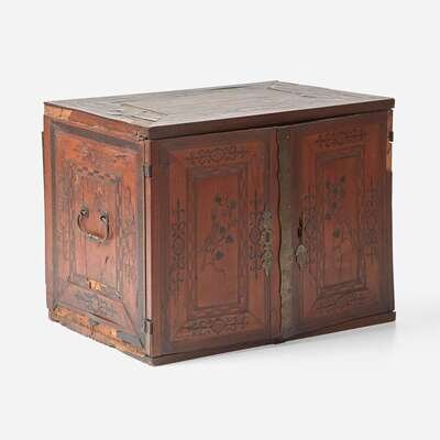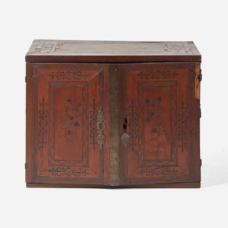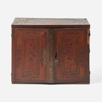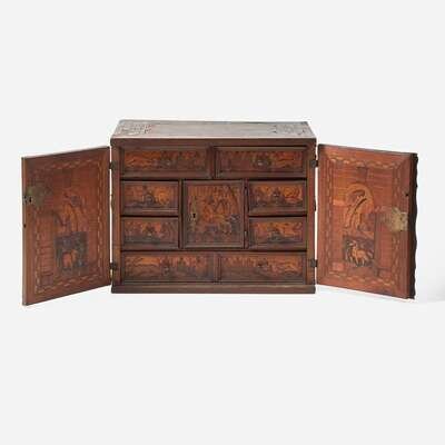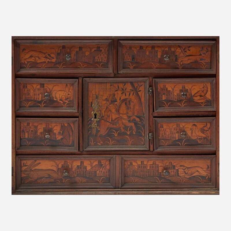 Each side with intricate marquetry, the sides with iron handles, the front with two doors inlaid with bird and branch motifs to exterior, the interiors with archways revealing landscapes with houses, parrots and goat and unicorn, seven small drawers surrounding central prospect door, all inlaid wtih different landscape scenes with dwellings and various figures and animals: cavalier on horseback, foxes, rabbits, crane, squirrel, and dogs.