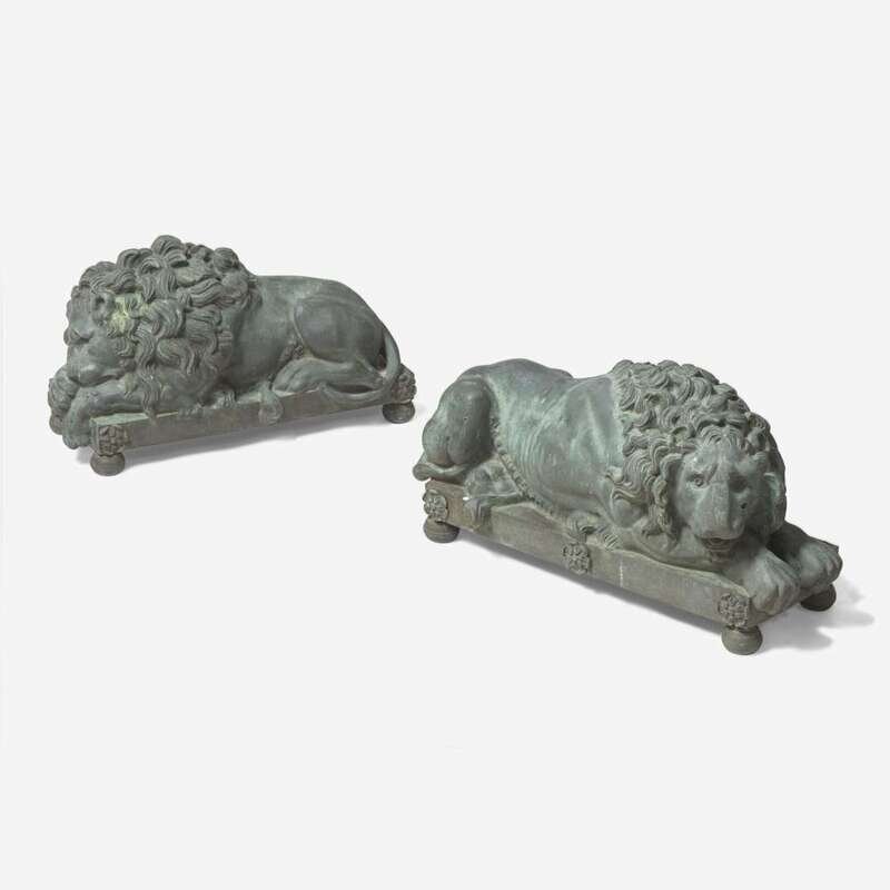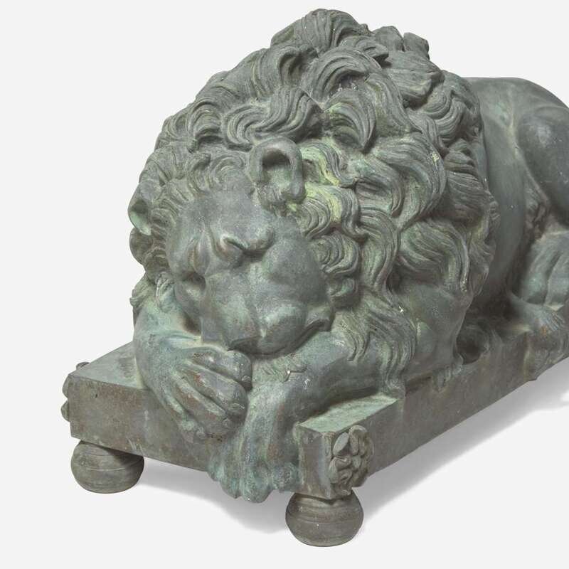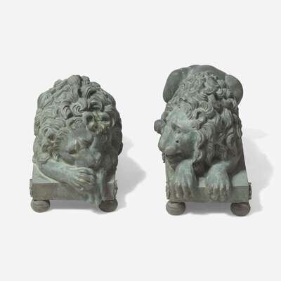 After Antonio Canova (Italian, 1757-1822) A Pair of Bronze Recumbent Lion Garden Sculptures, late 19th / 20th century