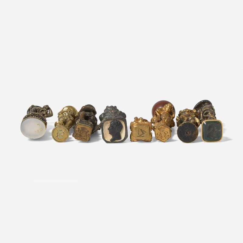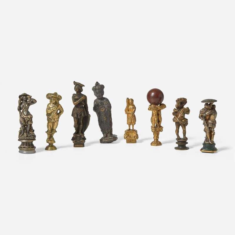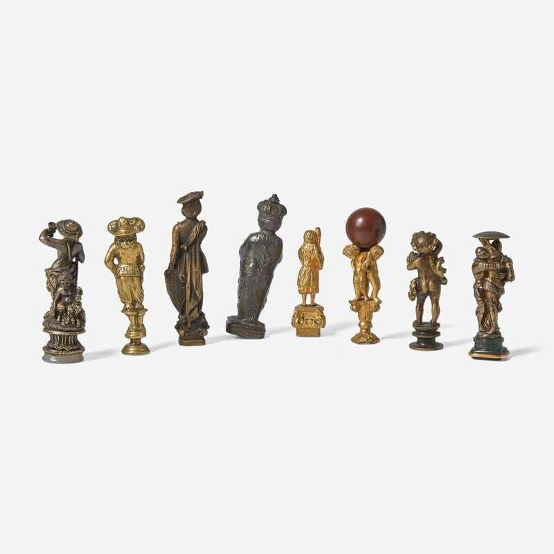 Comprising examples made with gilt bronze and other mixed metals, a few mounted with semiprecious stones, each depicting a different standard in the form of medieval knights, Renaissance or Baroque men, Bacchic figures, the Christ child, or putti, most bearing intaglio or armorial crest.