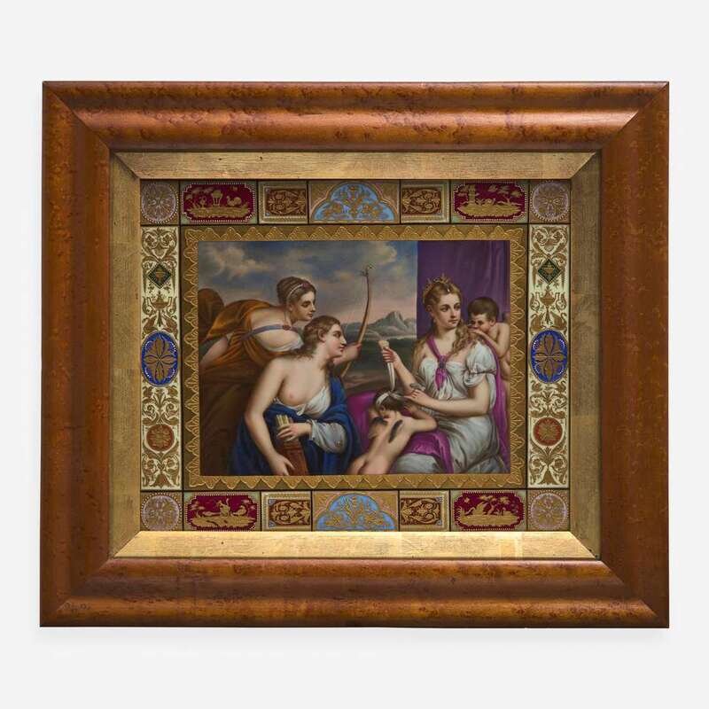 With painted border decorated with Classical motifs, the back inscribed in red, "Diana," framed.