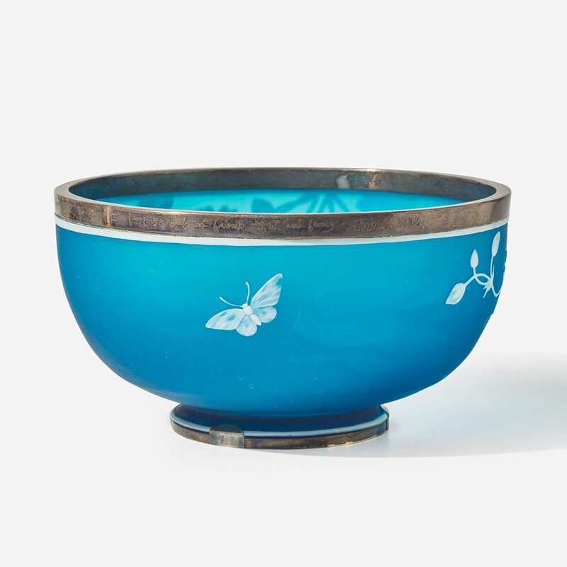 The bowl decorated with morning glory vine and butterfly, marked to underside, "Thomas Webb & Sons/ Cameo," the silver rim marked and inscribed, "Happy 25th Sir George III from your good friends Y.W. and family July 3, 1892."