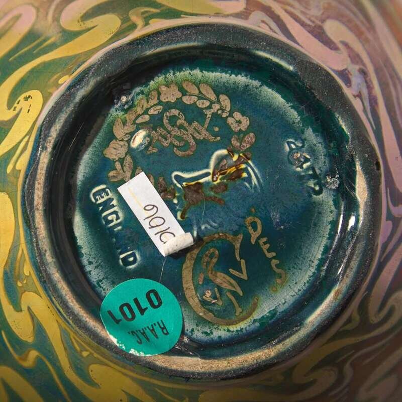 Depicting Classical ladies rowing trireme style boats with clouds above, marked to underside with impressed Pilkington stamp and "2472/ England," and signed with Crane cipher (Des.) and Mycock cipher.