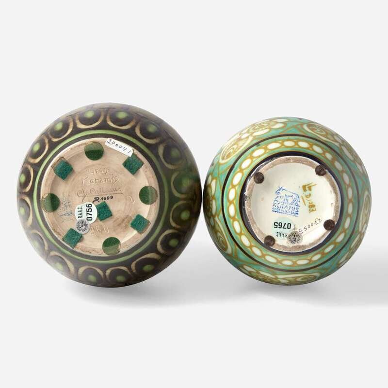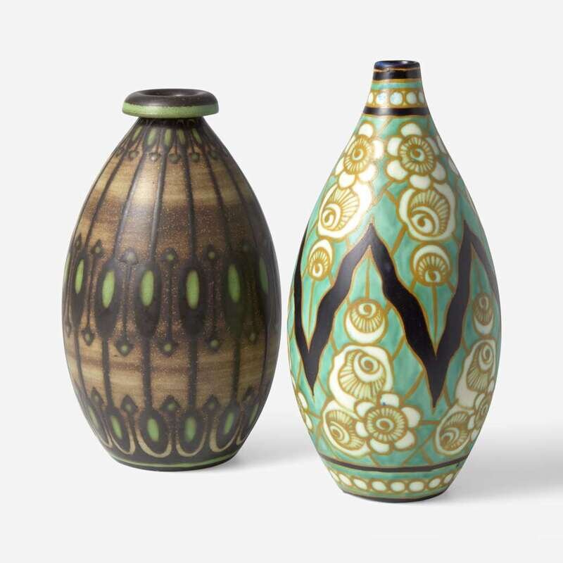 The first by Charles Catteau, with geometric designs, the underside signed, "Ch. Catteau D. 1000," incised "Gres Keramis," with impressed mark "960 2," and with stamped mark "Boch Frs La Louviere Made in Belgium Fabrication Belge"; the second by Léon Lambilotte, decorated with roses, the underside signed, "LL/ D1083/ 992," and with blue stamped mark, "Keramis/ Made in Belgium."