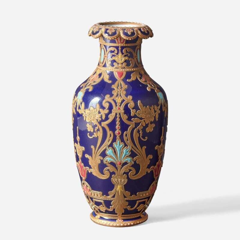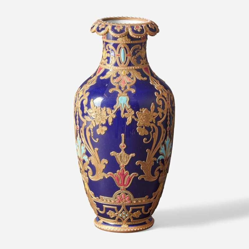 With cobalt blue ground, the overlay interspersed with polychromed enamel "jewels," marked to underside with underglaze blue sceptre and "E," stamped red orb mark, and impressed "G" and "13."