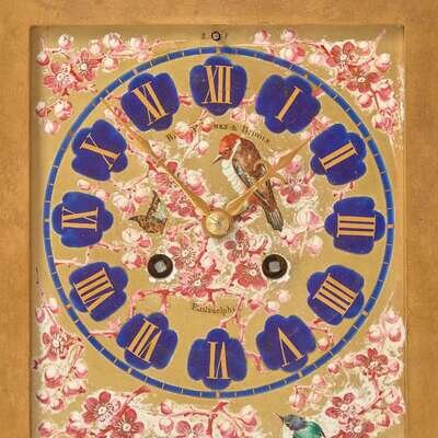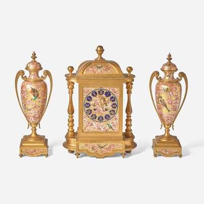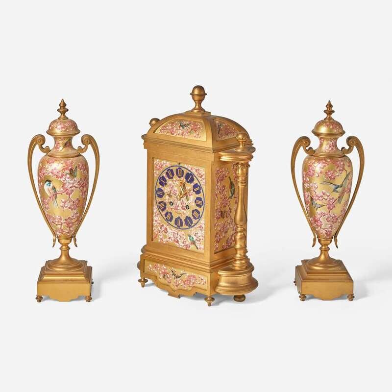 Of Japanesque style, comprising a clock and two urns, the clock with domed top surmounted by finials, all three pieces decorated with hand-painted enamel birds and butterflies among cherry blossoms, the clock dial signed, "Bailey Banks & Biddle/ Philadelphia," the works marked to back with stamped Japy Frères mark and "EM/ 5202."
