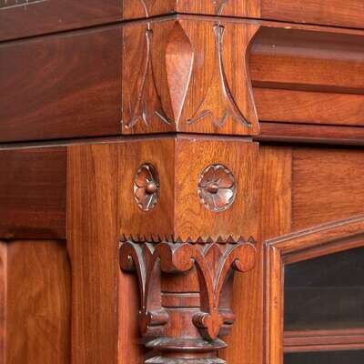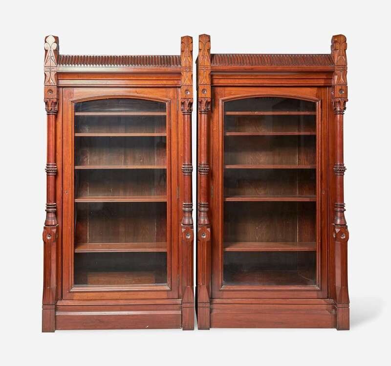 Walnut, glass, brass hardware, of architectonic form and in two parts (a left and right, each with one finished side and one unfinished side, and with unfinished backs), when combined presenting with two doors with arched glazed openings, below a ridged “roof”, punctuated by trefoil-carved finials incised with stylized foliate motifs, all flanked and centered by composite columns with stylized foliate capitals, on engaged plinths, a band of bosses punctuating the circular shafts, concave rosettes above the capitals and below the socle, all on a tall plinth base with sloped front; each cabinet with five movable shelves and ten shelf cleats; key present.