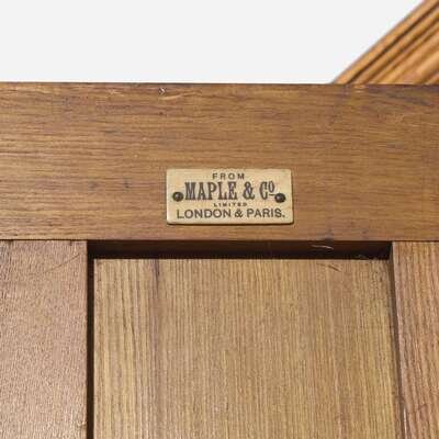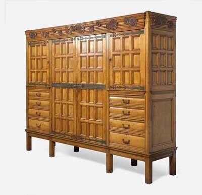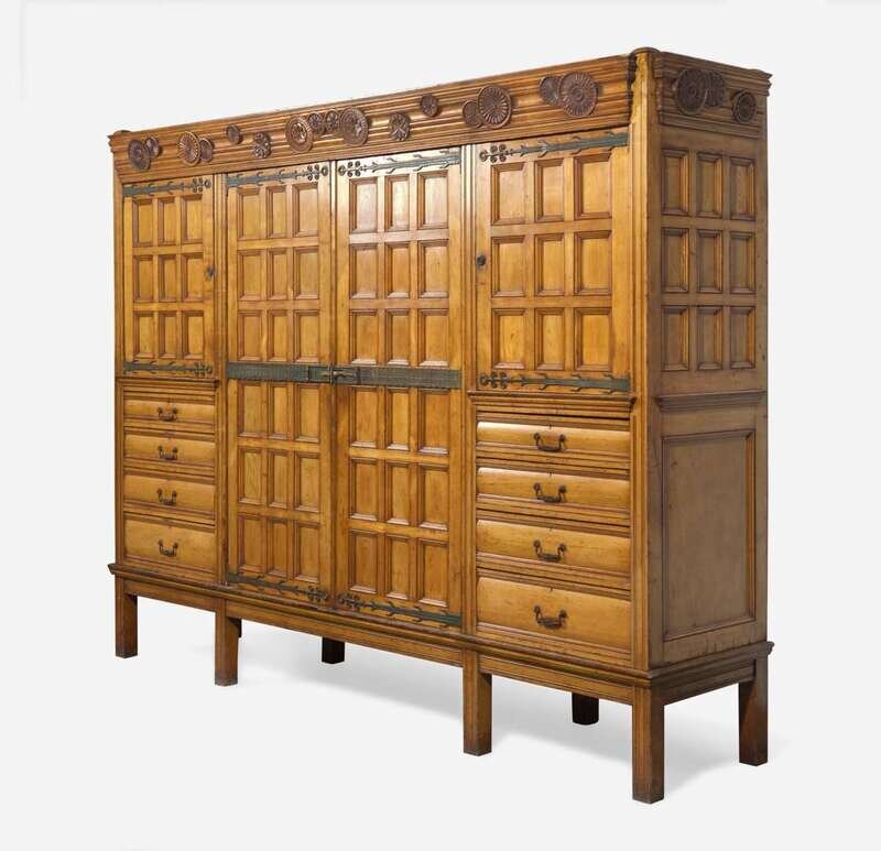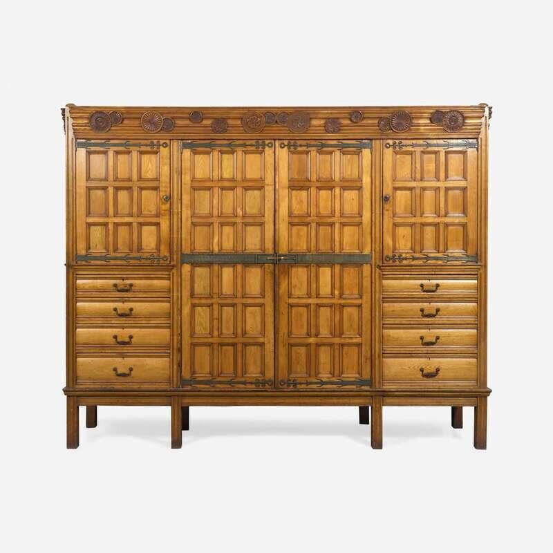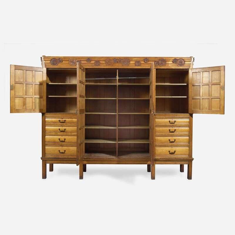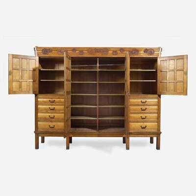 In five parts, comprised of the base, center cabinet, two flanking cabinets, and cornice; accompanied by fourteen removable shelves; with bold, stylized iron hardware, the cornice with "scattered" carved rosettes of various forms, the center cabinet with two paneled doors, the side cabinets each with two paneled doors over four graduated drawers, paneled sides, the base on straight legs; bearing applied labels inscribed, "From Maple & Co./ Limited/ London & Paris."
