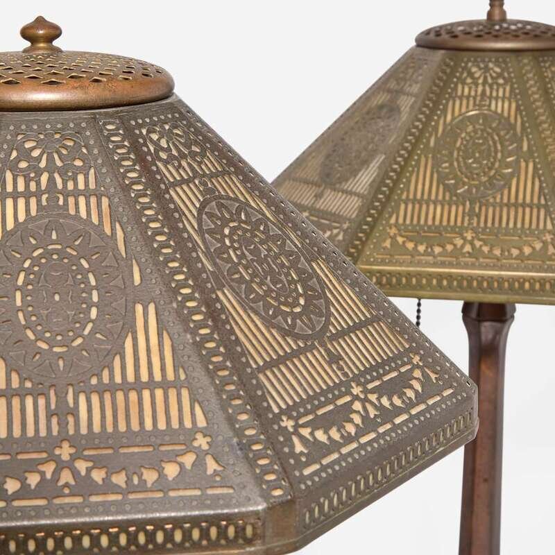 Patinated bronze and slag glass, the shades marked, "Tiffany Studios/ New York/ 1412," the bases marked, "Tiffany Studios/ New York."