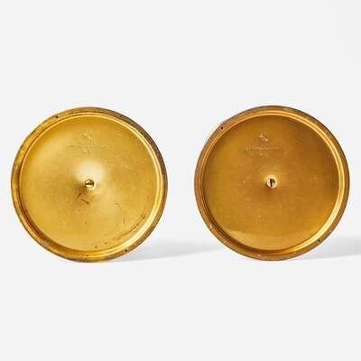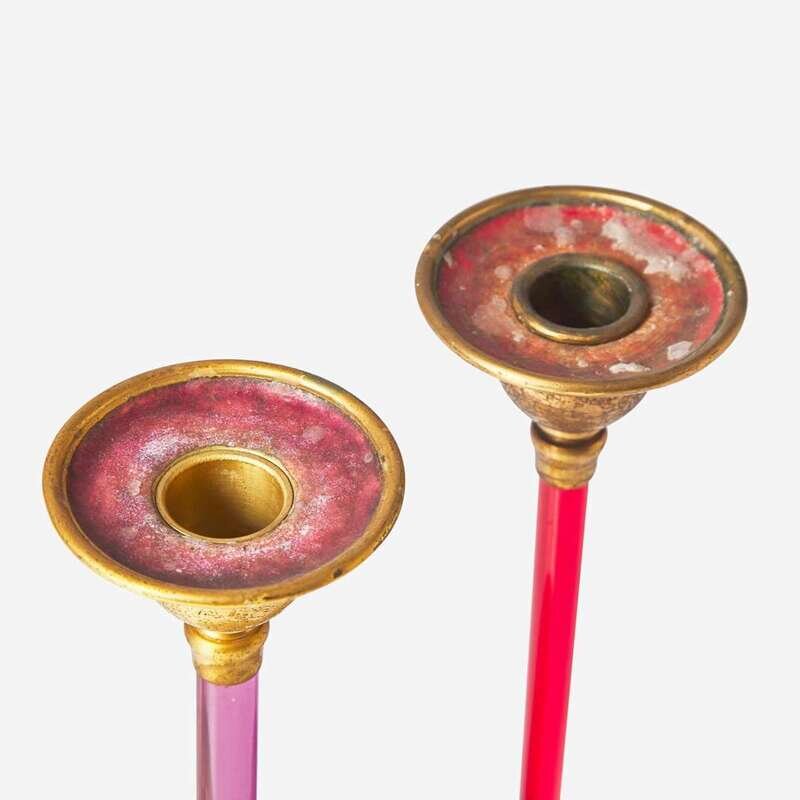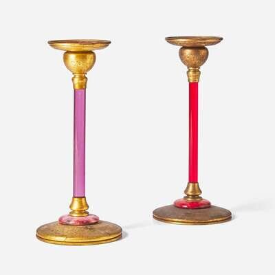 Louis C. Tiffany Furnaces, Inc. (American, active 1920-1928) Two Red or Pink Glass and Enamel Candlesticks, New York, NY, 1920s
