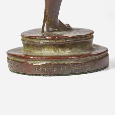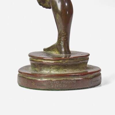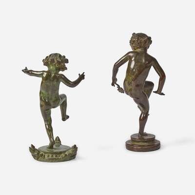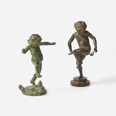 Bronze, the child with crab signed and numbered, "Bonnie MacLeary/ #114," and stamped, "Gorham Co. Founders/ OFCW"; the child with frogs stamped, "Gorham Co. Founders/ OAVD."