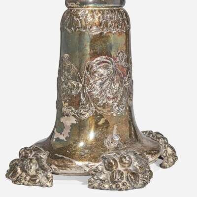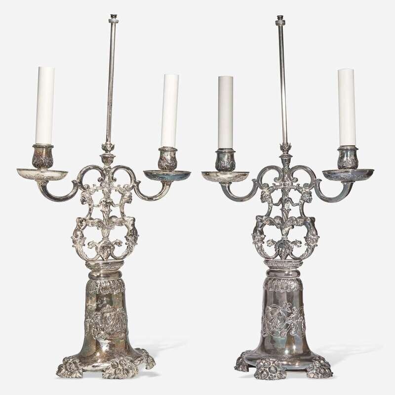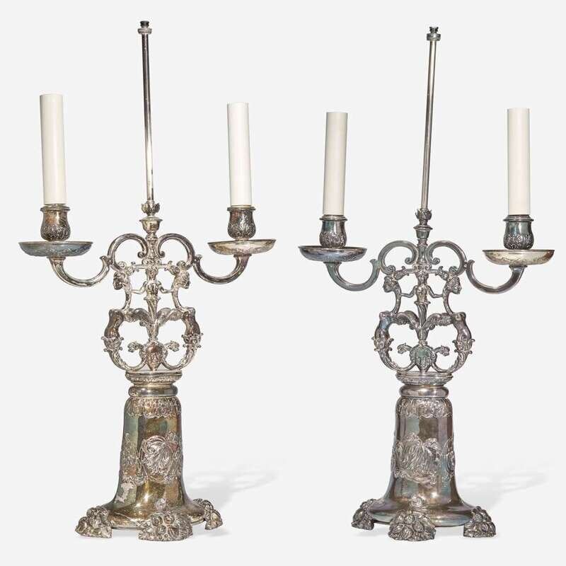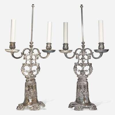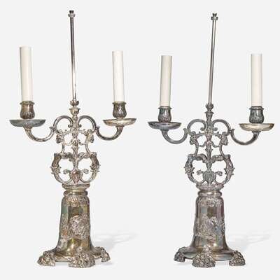 A pair of silver metal table lamps in the form of two-light candelabra Edward F. Caldwell & Co. (active 1895-1959), New York, NY, early 20th century