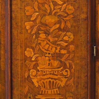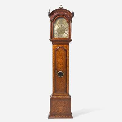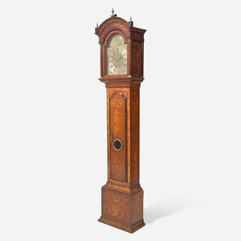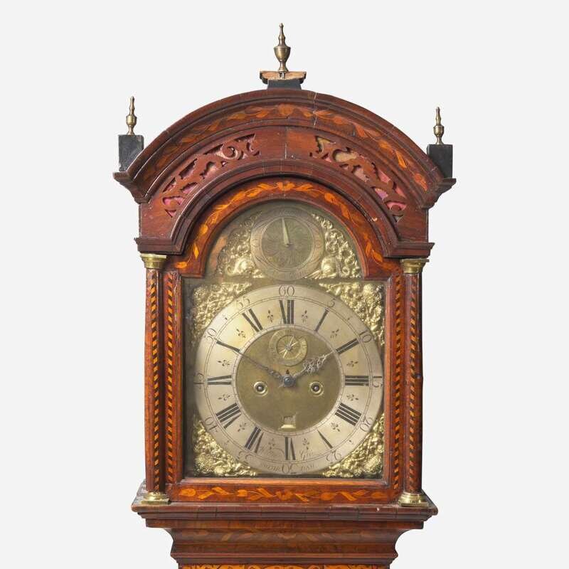 With arched hood having patterned inlay and floral marquetry, fretwork, and brass finials, the hood door with columnettes to corners, the case allover decorated with marquetry featuring flowers, foliate motifs, birds, and butterflies, the case door with arched top and round glass pane, molded plinth on molded base, the brass face with applied spandrels in the form of dolphins and putti supporting crowns, inscribed, "William Gib/ Rotterdam."