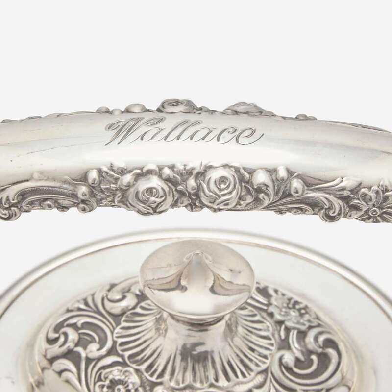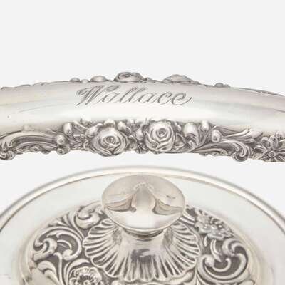 Decorated with repoussé floral motifs, the handle engraved, "Wallace," marked.