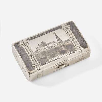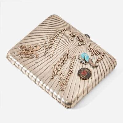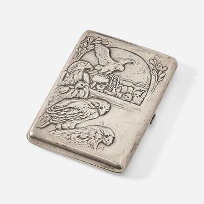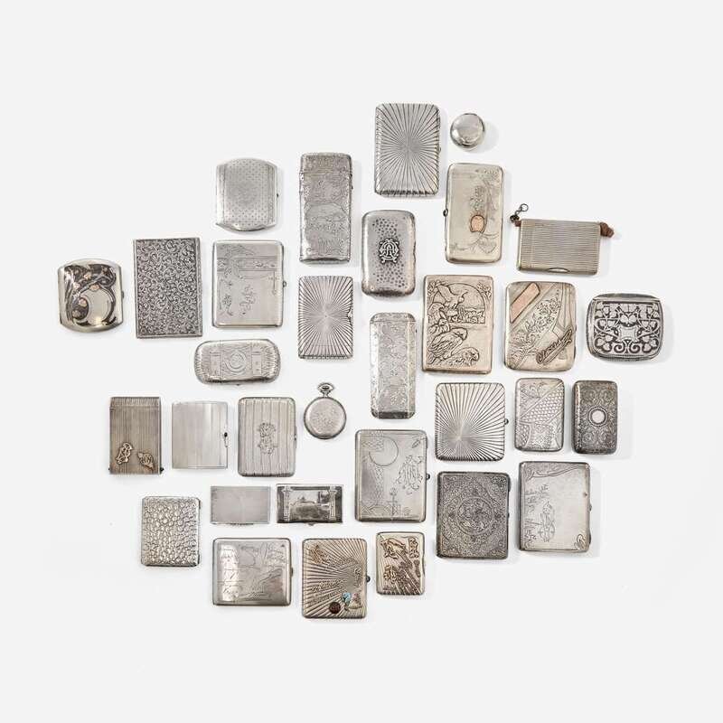 All variously decorated, some bearing repoussé or applied details and some with gem-set clasps, and others with inscriptions; comprising eighteen Russian silver cigarette or card cases by various makers, with unattributed marks and other marks possibly attributed to the following: Alexey V. Stepanov, Assaymaster Ivan Efimovich Konstantinov, Moscow; Alexsandr Karpov, St. Petersburg, 1908; Fyodor Ivanov, Assaymaster possibly Ivan Sergeyevich Lebedkin, Moscow, 1898-1908; Ivan Petrovich Speshnev, Moscow, 1894; and Nichols & Plinke, St. Petersburg, circa 1890s; and twelve Continental silver cigarette or card cases by various makers including the following: two by Louis Kuppenheim, Pforzheim, Germany, early 20th century; two French silver examples, one with St. Petersburg import mark and assaymaster mark for Dmitry Ilyich Tverskoy; an Austrian engine-turned case hallmarked for Vienna, circa 1922, unidentified maker; and other German or Austrian examples bearing .800, .875, or .900 standard marks; sold together with a Russian silver pocket watch and a silver pill box, Austrian, maker, "JR," inscribed and dated, "Ostern 1933"; most items marked. (32 items total).
