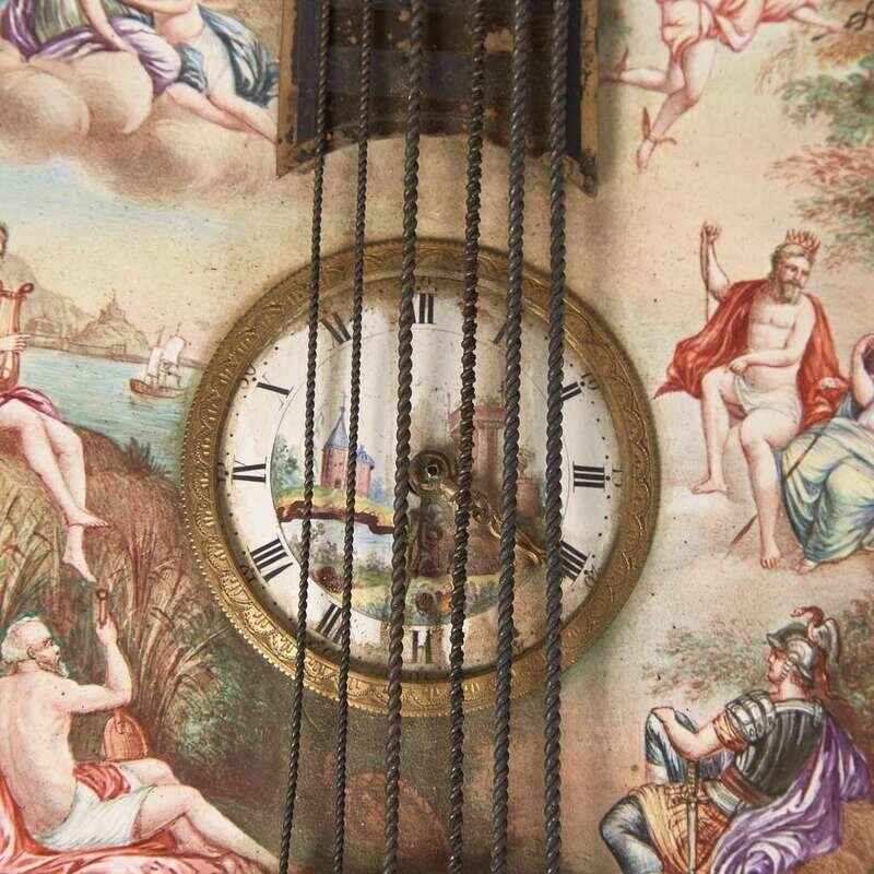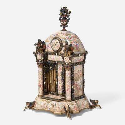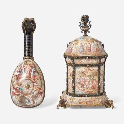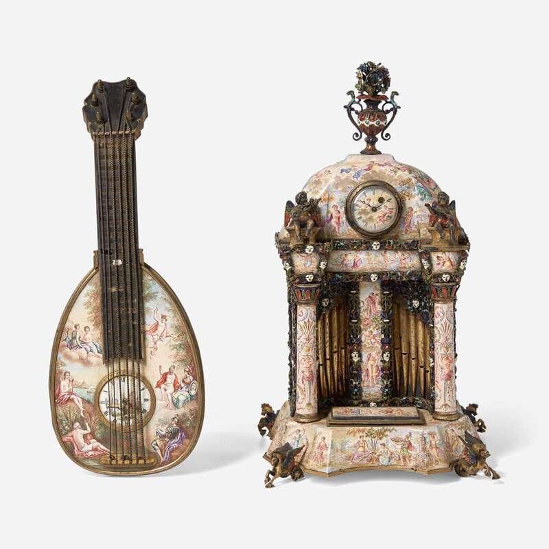 Allover decorated with hand-painted enamel Greek mythological scenes, the first, a music box in the form of a pipe organ, by Karl Bank, with domed top having floral urn finial, flanked by columns surmounted by putti, on shaped base with feet in the form of hippocampi, with inkwell, marked twice with maker's mark, "KB," and marked with regional assay office letter, "A"; the second, in the form of a mandolin, with hinged back revealing compartment, the back of clock works signed, "Johann Mayer in Wienna," marked three times with maker's mark, "PL," and also marked twice with regional assay office letter, "A."