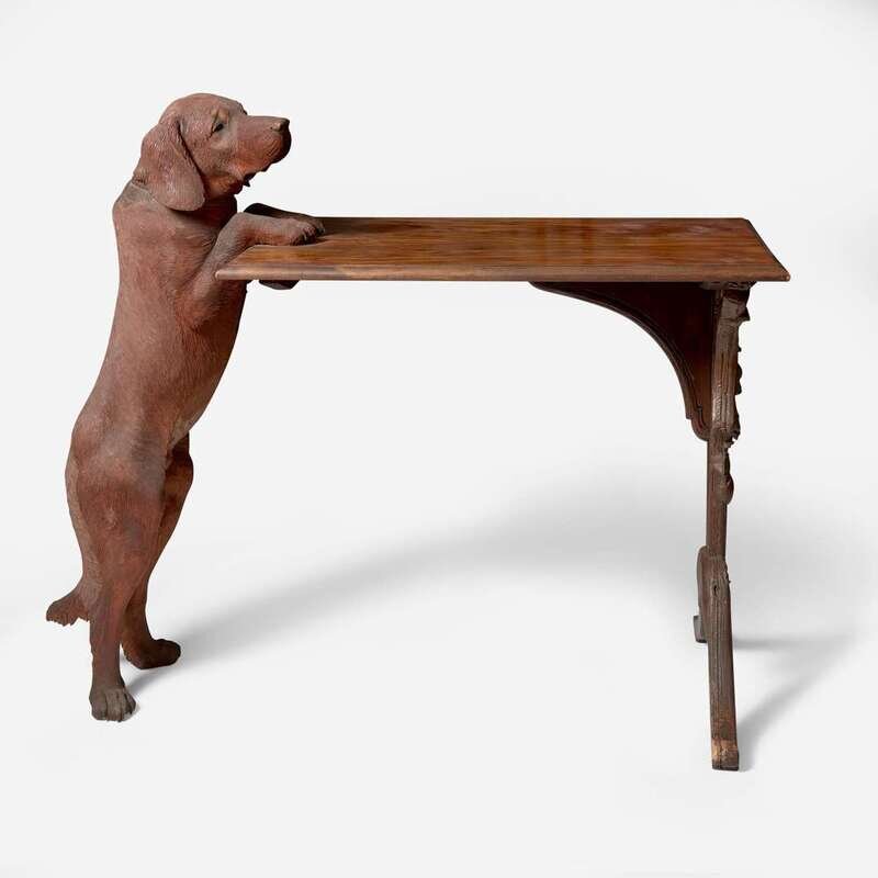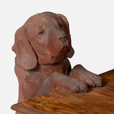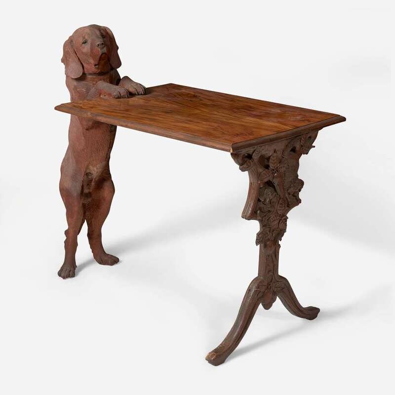One end in the form of English Labrador with paws on table, the other end with pierced and carved leg with two flared feet, decorated with two dogs among fruiting tree branches; retaining original label underside inscribed, "Sculptures Binder/ Fabr. Brienz, Depot Lucerne/ Suisse."